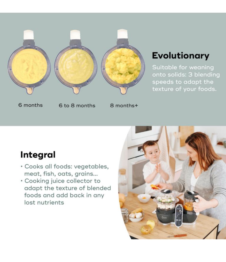 The Nutribaby+ combines 5 appliances in one streamlined stylish unit. This one machine does it all - it can steam, blend, sterilise, reheat and defrost. This means you save space and money with a product that will meet your family's needs over time.