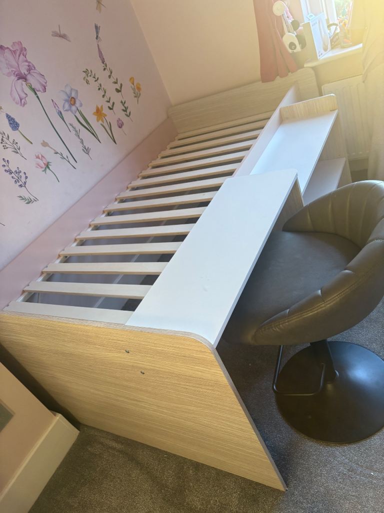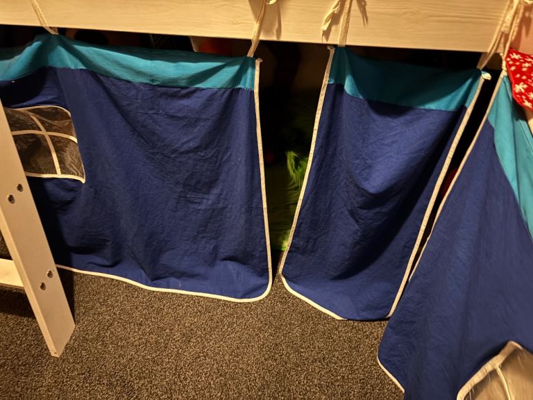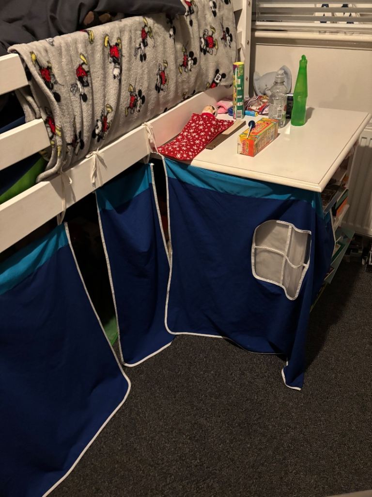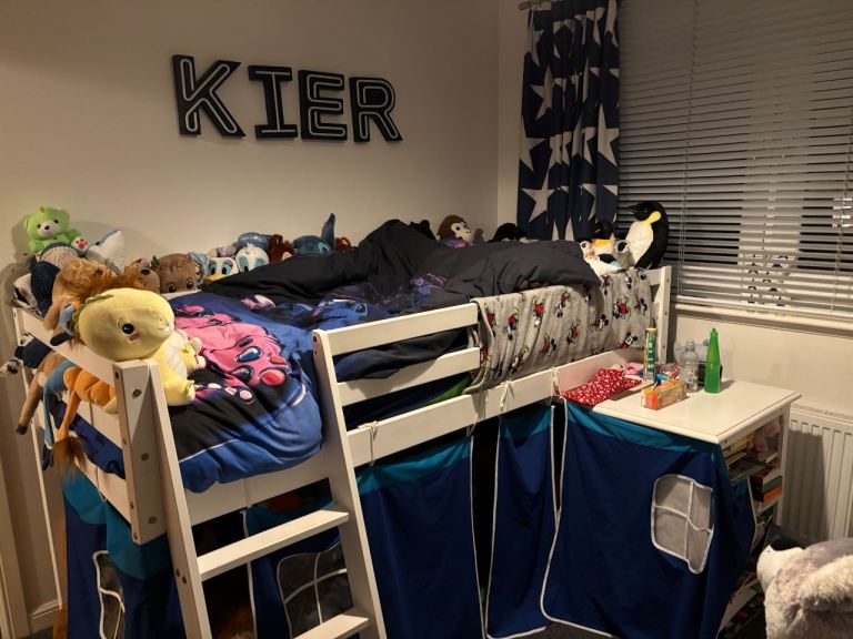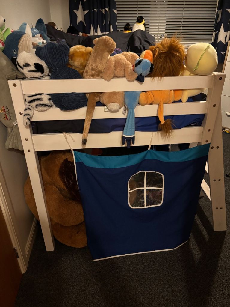 Cabin bed with tent, desk, book case, Jaybe single mattress all in great condition. The cabin bed sizes are in one of the pictures. Smoke free home. the desk and ladders can be fitted at opposite ends. Bed has been dismantled ready for collection