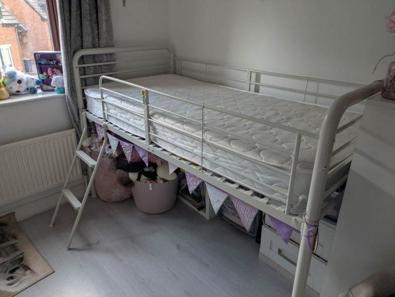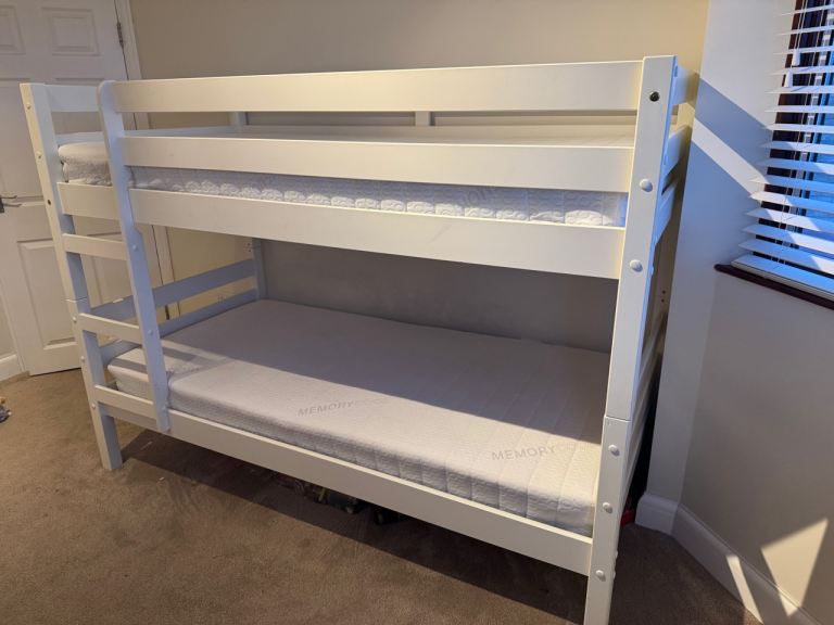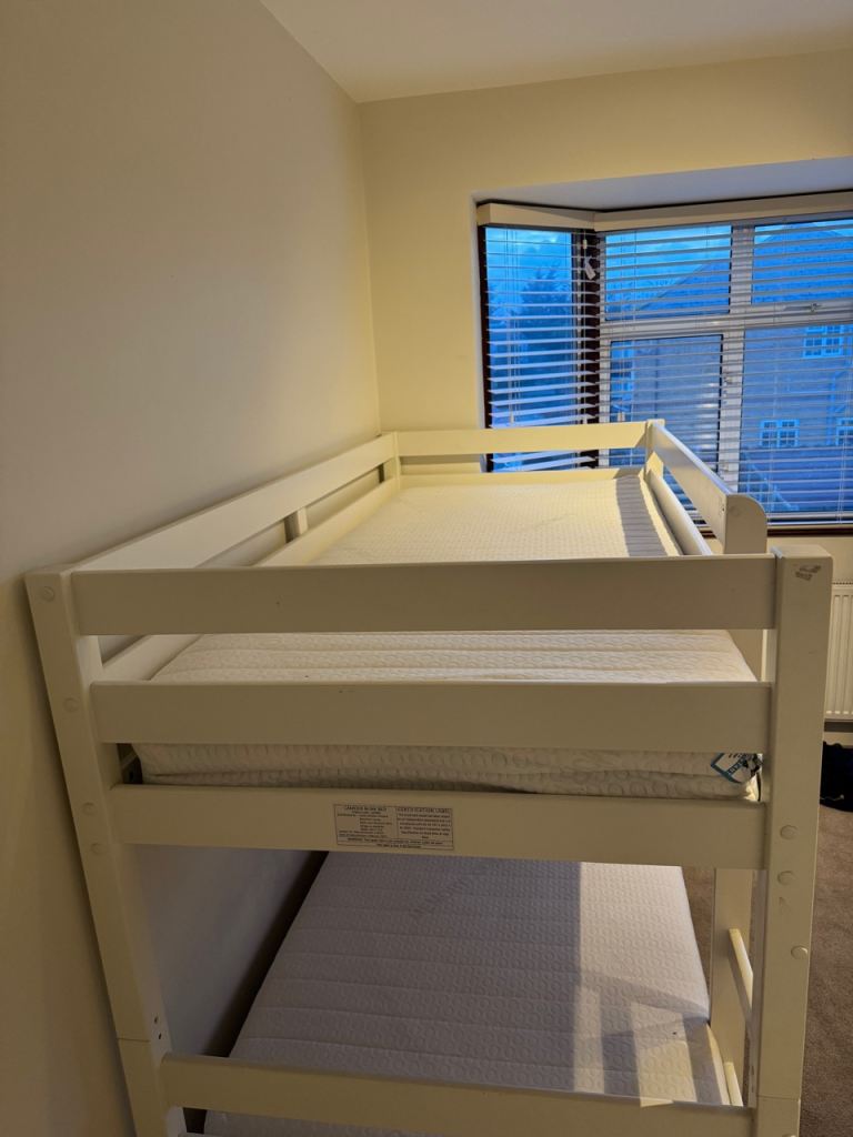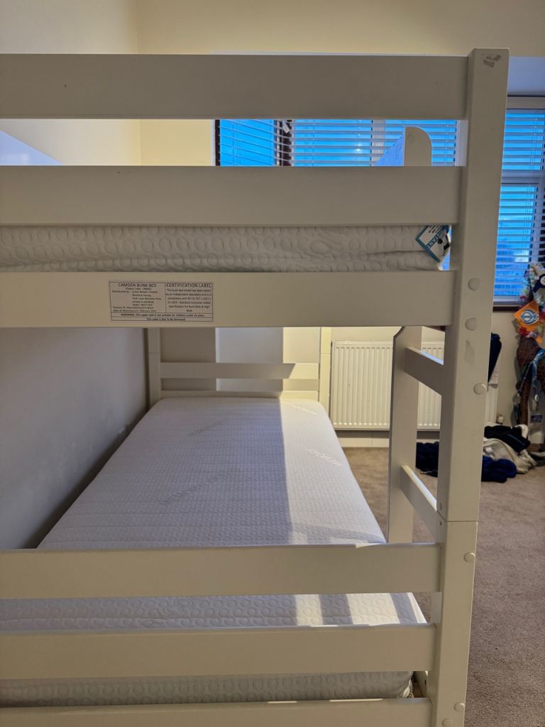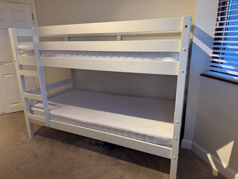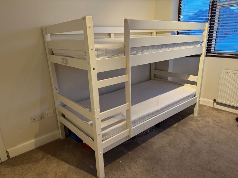Children's white bunk bed for sale. 2 years old but hardly used. comes with mattresses, one never used, the other used for 6 months.