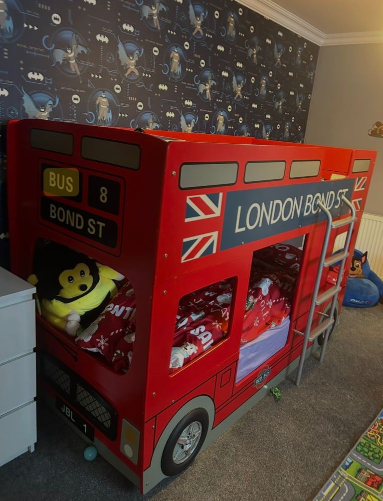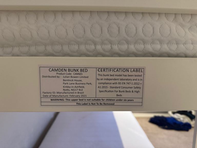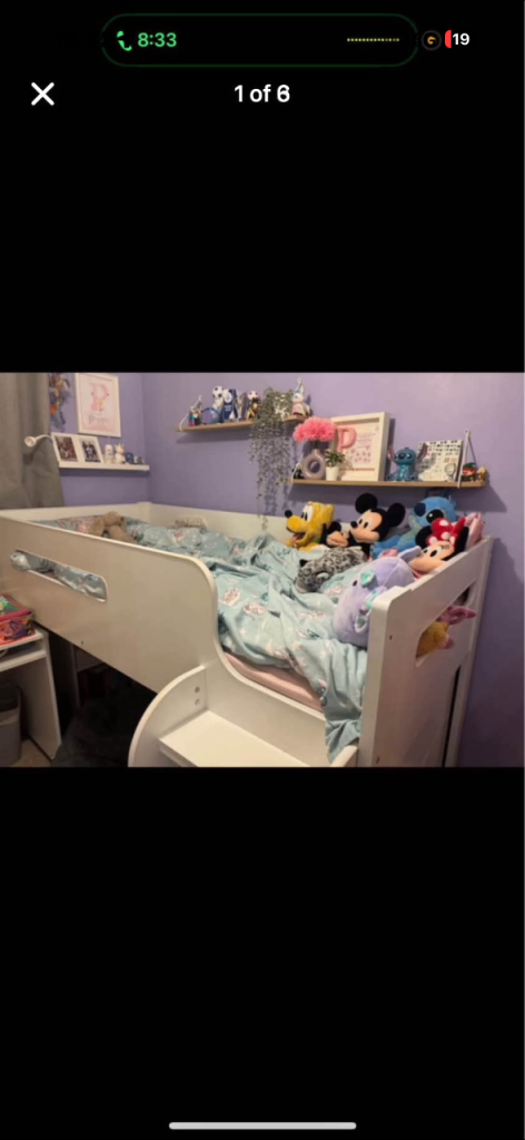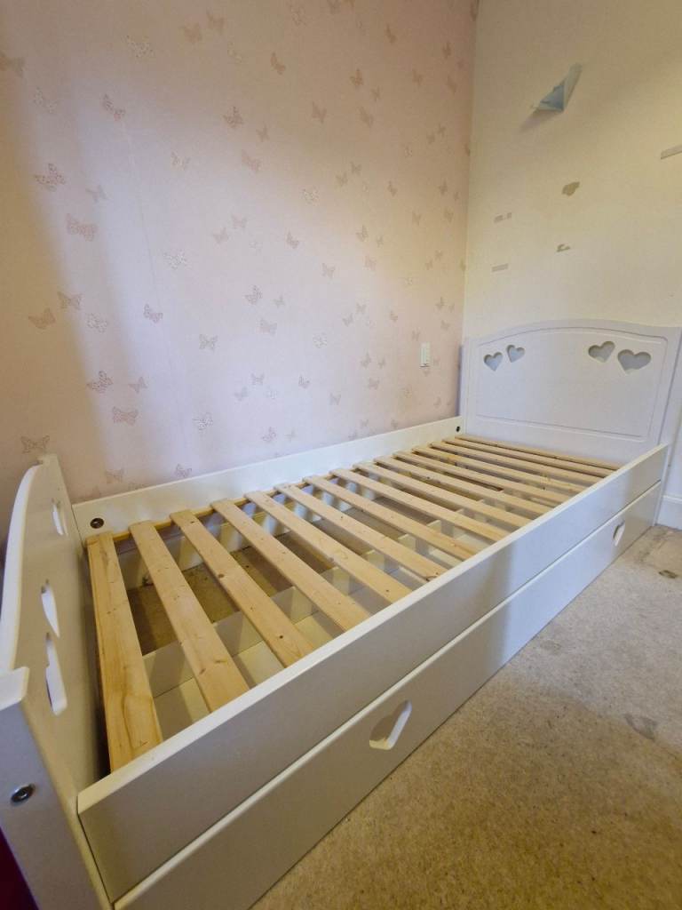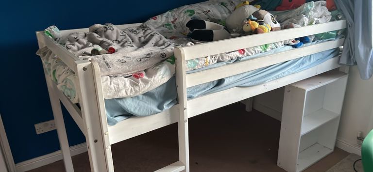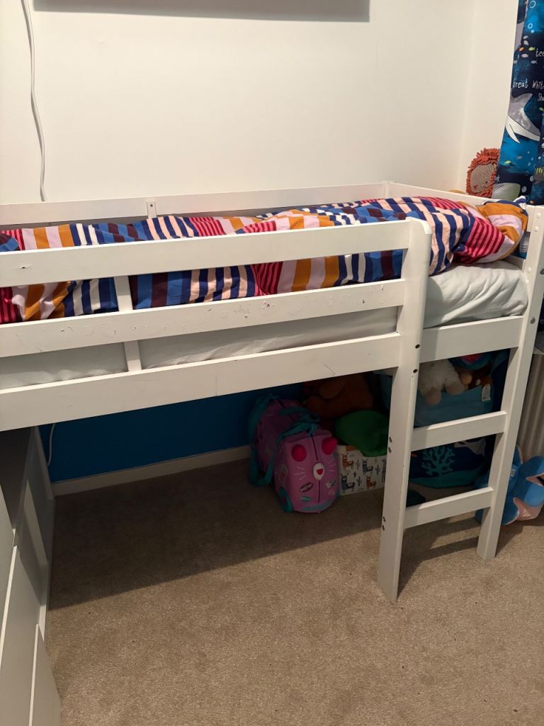 Children's white bunk bed for sale. 2 years old but hardly used. comes with mattresses, one never used, the other used for 6 months.