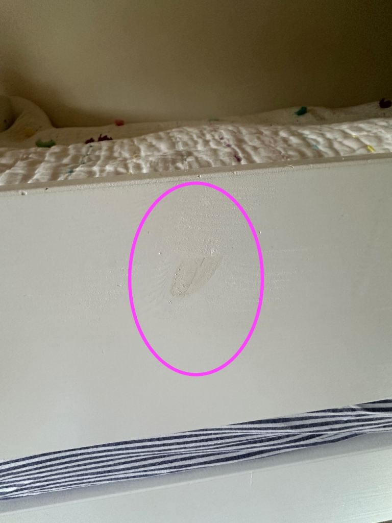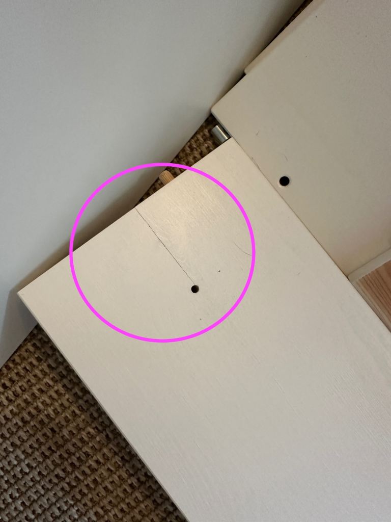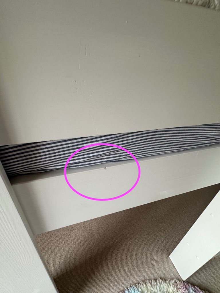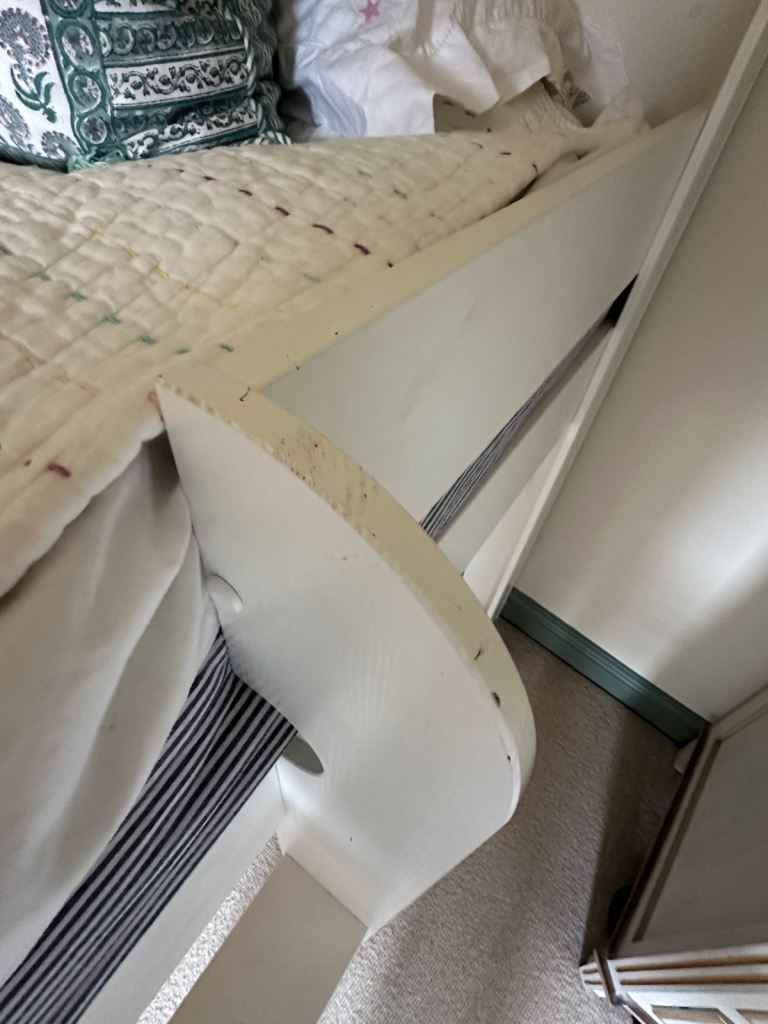 Bed in generally good condition, only been used for 2.5 years, a few dings and some of the wood knots are a bit visible through the paint now. One of the side slats has a crack in it but you could put this against a wall as we did and it would not be visible.