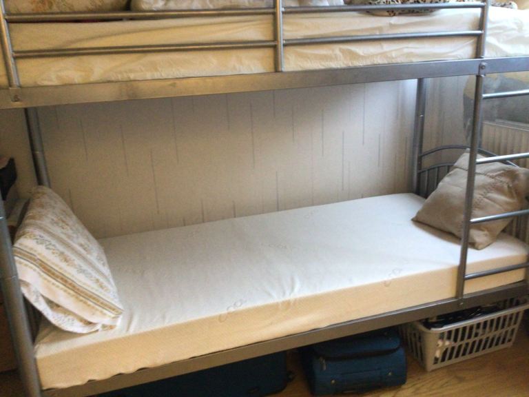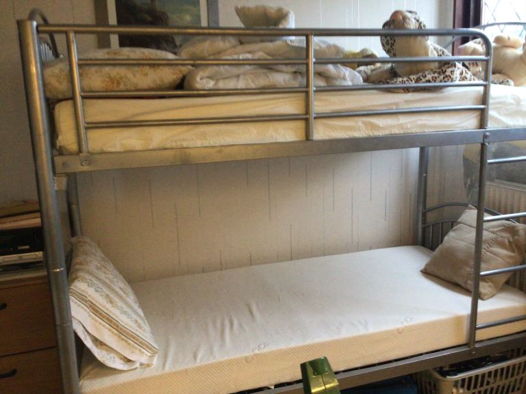 Silver steel bunk beds, with memory foam mattress.