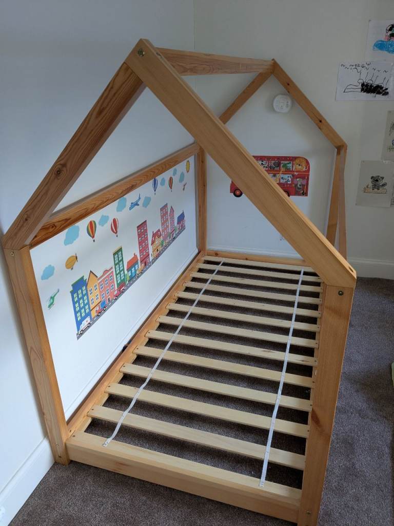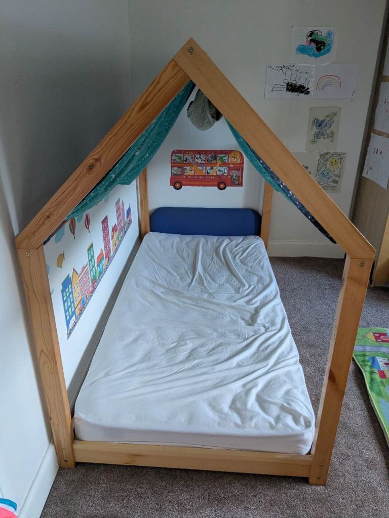 Low wooden frame bed, ideal as first bed. Includes handmade stars and moon canopy.