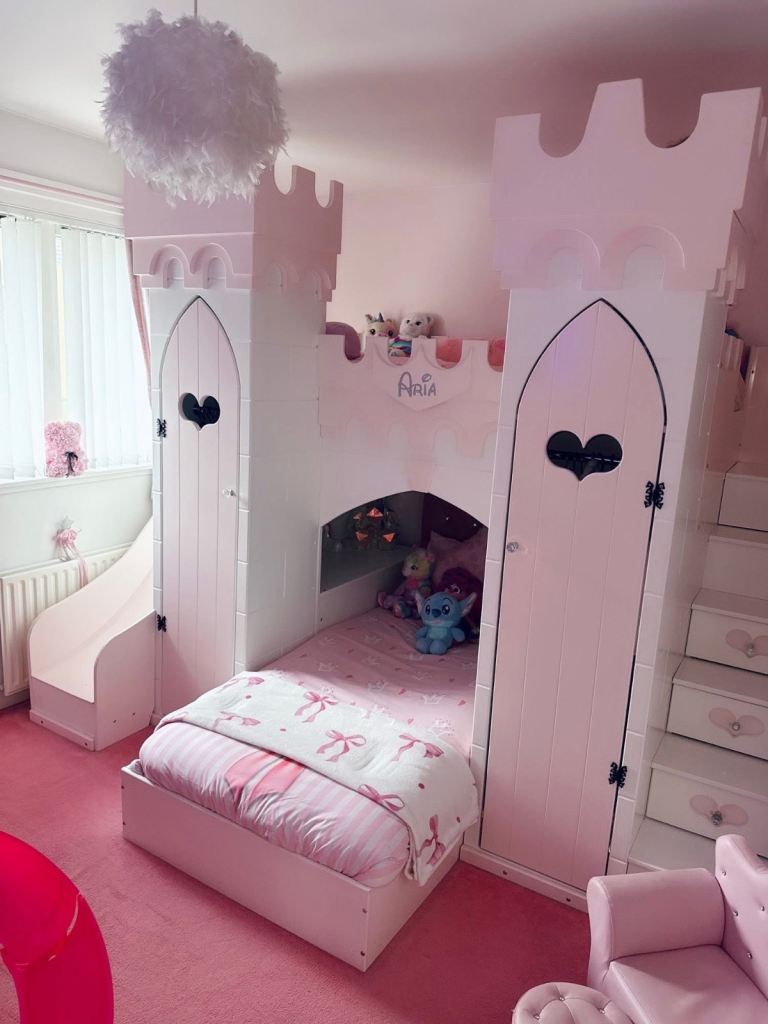 Princess castle bunk bed with chute and stairs 2 cupboards on each side stairs on right side chute on the left with 3 drawers on the stairs and led star light in bottom bed was £6000 brand new
