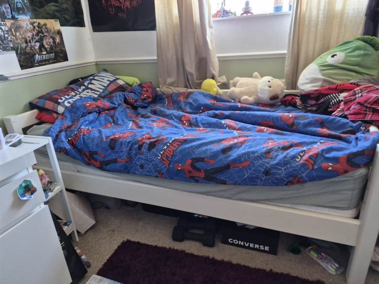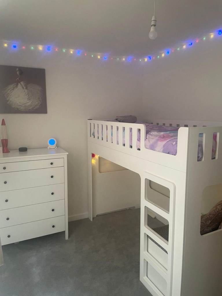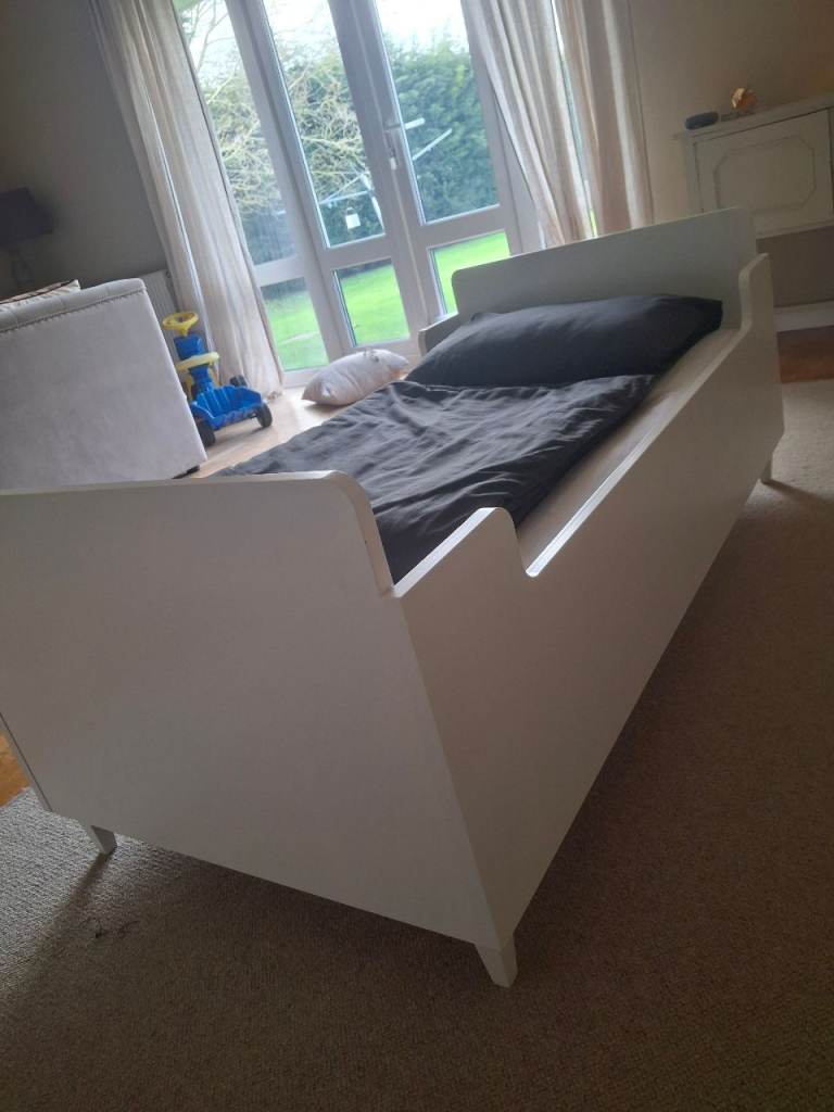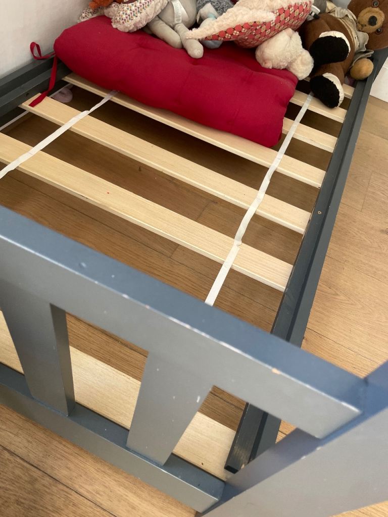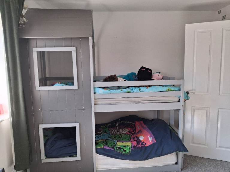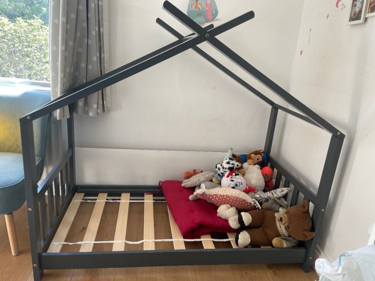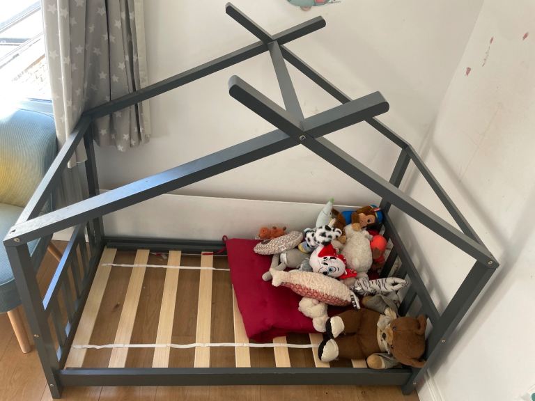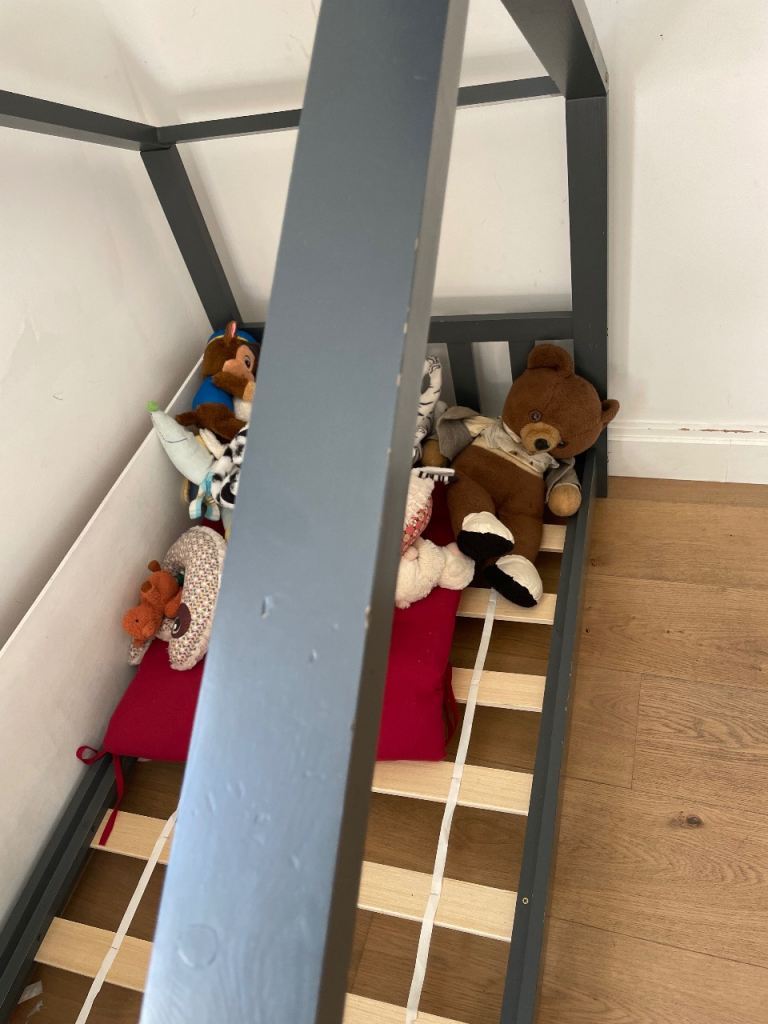 Wooden Toddler cabin bed. Dark grey. 70x140. Used but in good condition, few scratches as seen on pictures. Sold with mattress if interested.