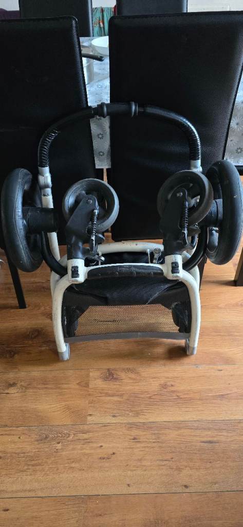 Stroller Chassis: Lightweight white frame with adjustable handle height and a shopping basket.
