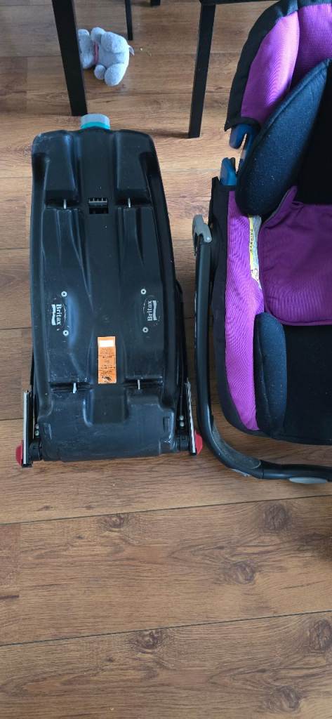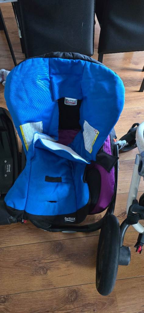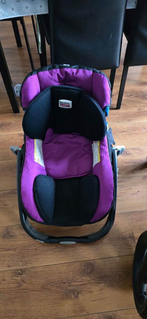 Infant Car Seat: Britax baby carrier with side-impact protection (purple/black).