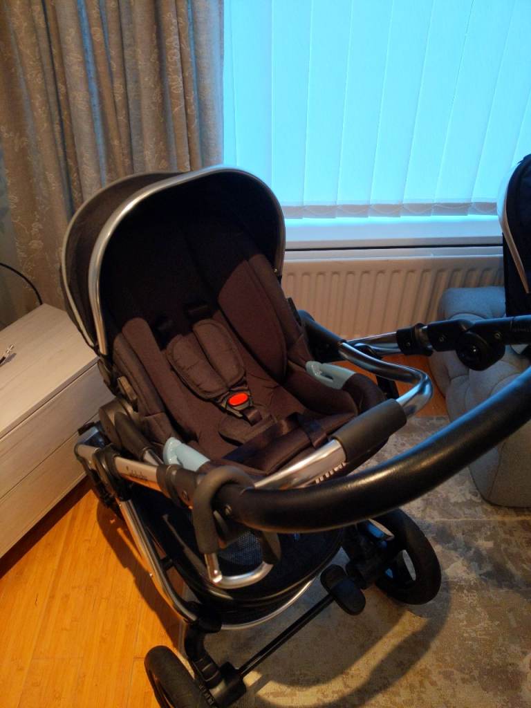 3 in 1 pram / stroller system comprising of car seat, pram and pushchair bodies all fixing into universal frame ,basket underneath and rain cover all in excellent almost new condition pet and smoke free home