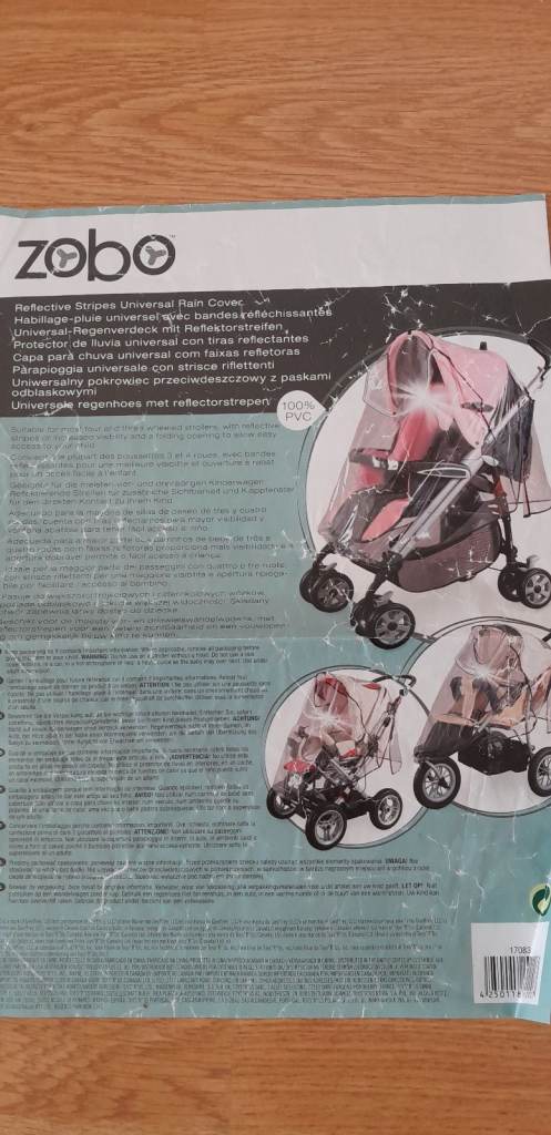 Zobo pram rain cover 100% pvc in good condition. Clean and fully functional, ideal for protecting your baby from rain, wind, and cold weather. Easy to fit and practical for everyday use.