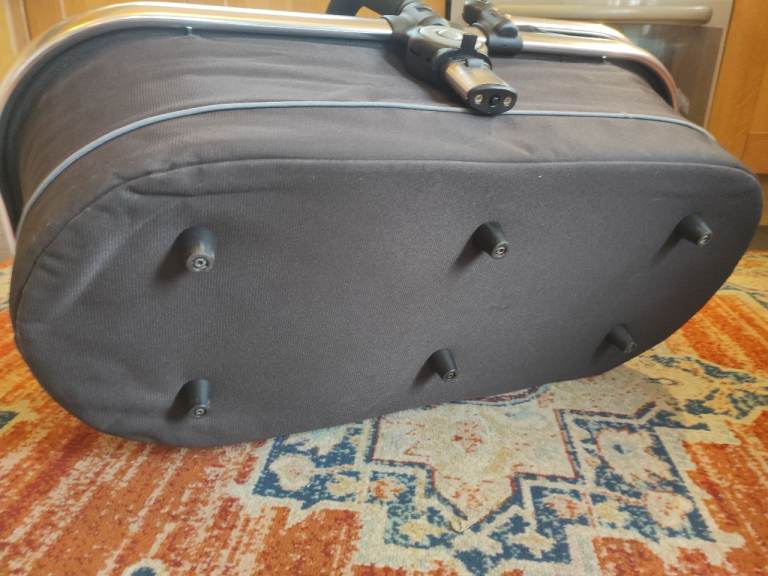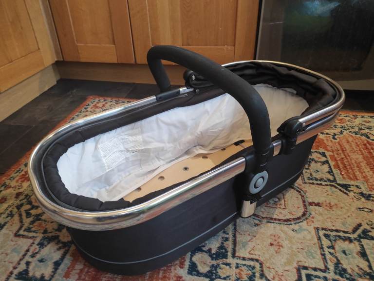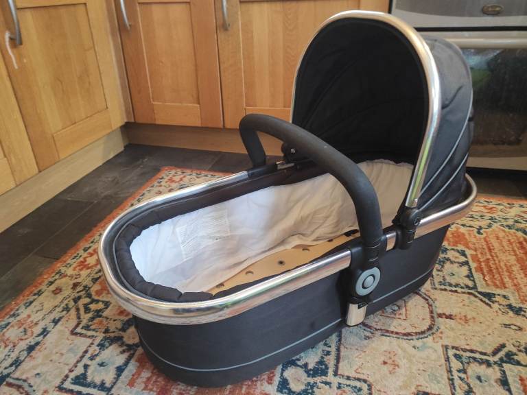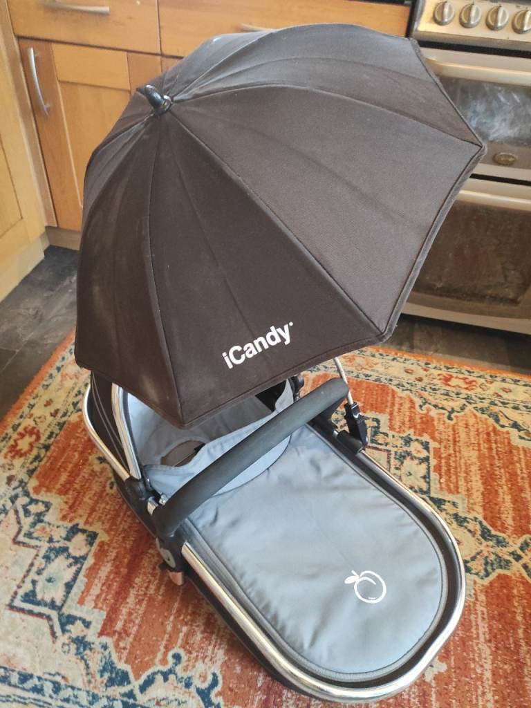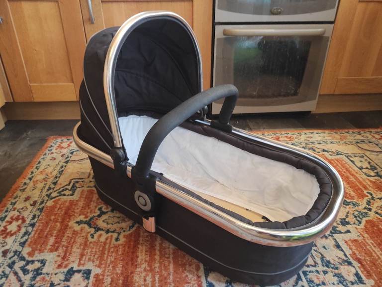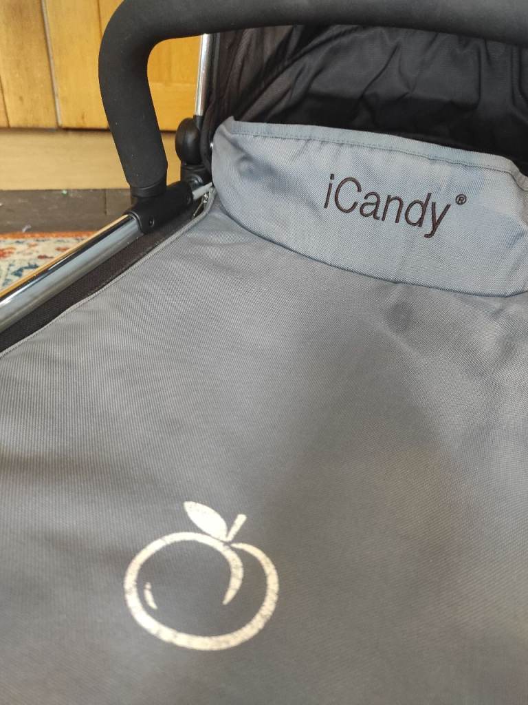 iCandy Peach pram, buggy, stroller Carrycot/Bassinet. Excellent condition. Solid and sound. Complete with carry handle, sun shade/parasol/umbrella, apron and original rain cover. Main unit, handle and apron are in excellent condition, parasol has a little rust on the metal Flexi section of the upright, rain cover has a small tear on the side (see photo). We've thrown away the mattress because it's best to get your own new one (but these are only ~£15-20 and widely available). This listing is for the carrycot/bassinet and accessories only, and does not include the main iCandy frame/wheel base.