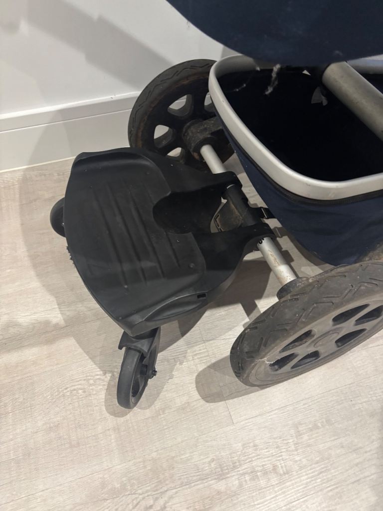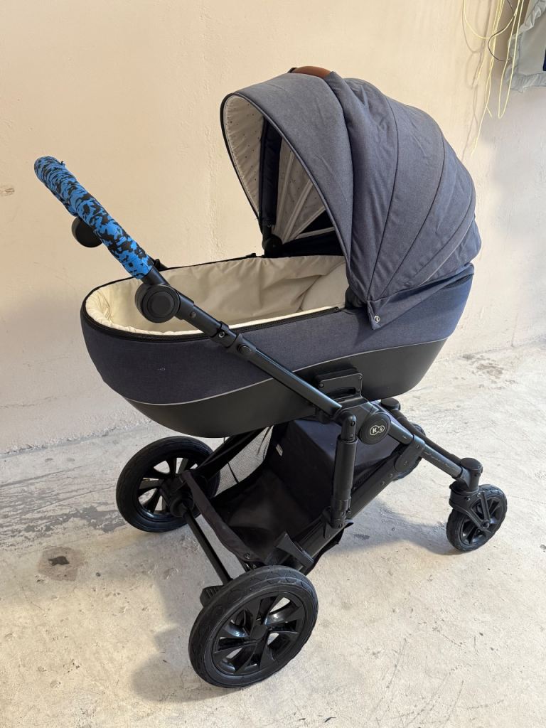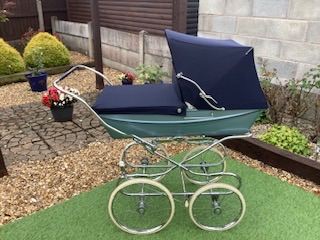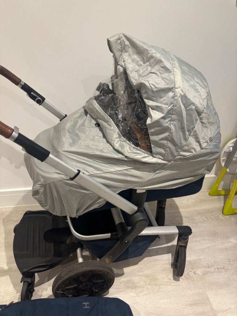 Convertible pram - cot top to pushchair. Forwards or backwards facing. Foldable. Navy. Leather handle. Has parasol, rain cover and also travel bag for flying. Also a cup