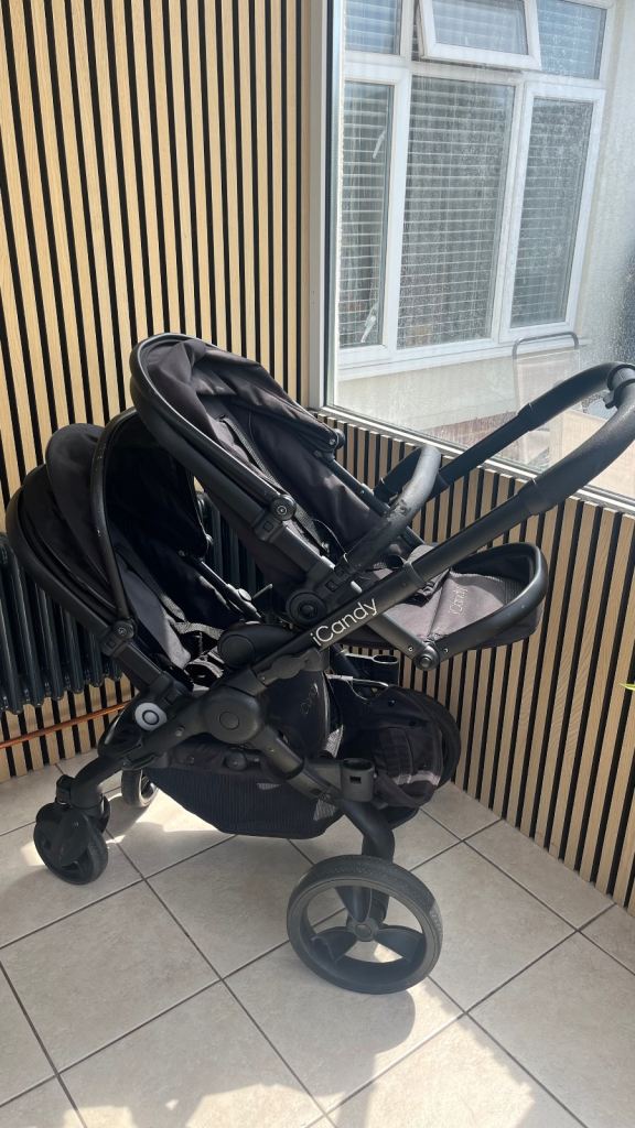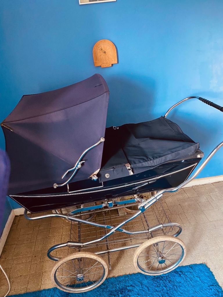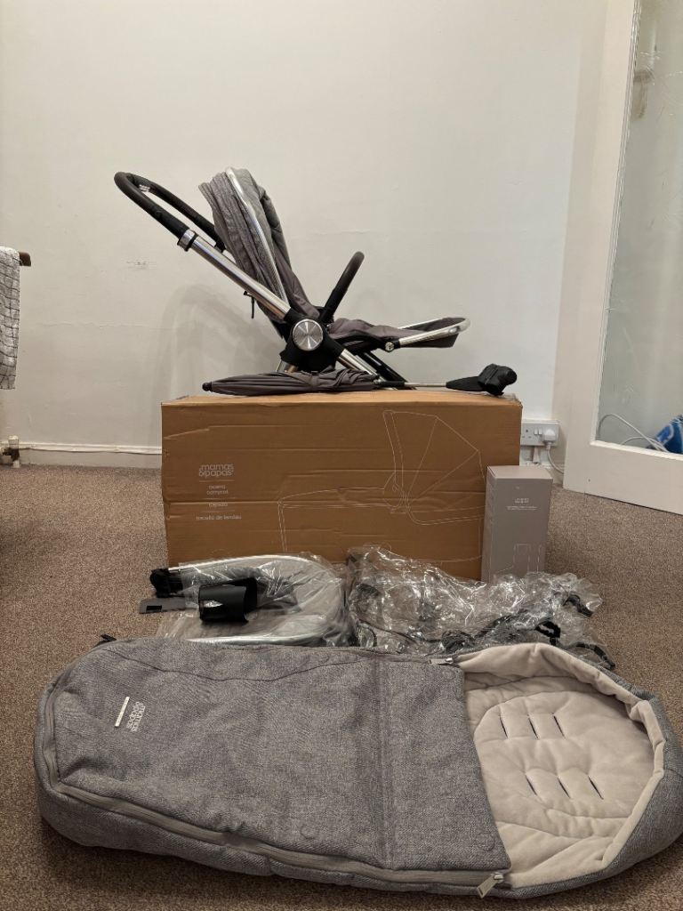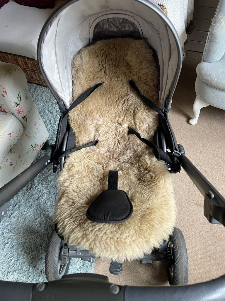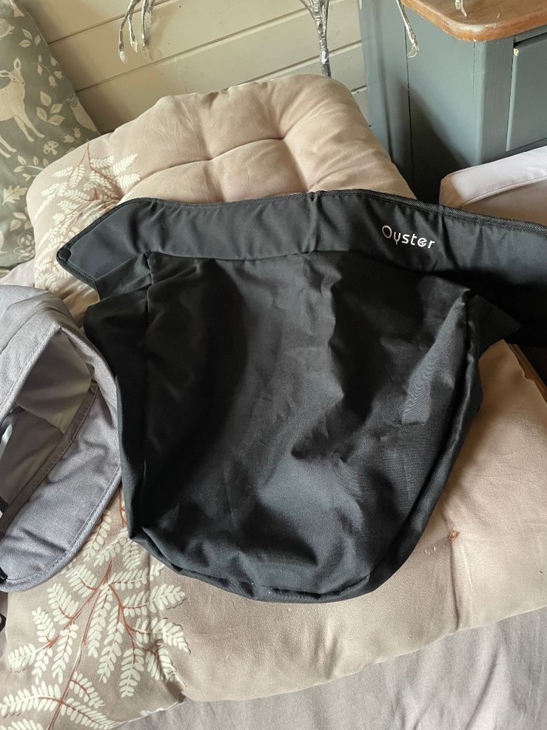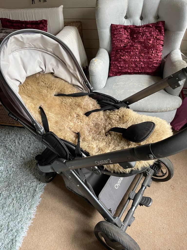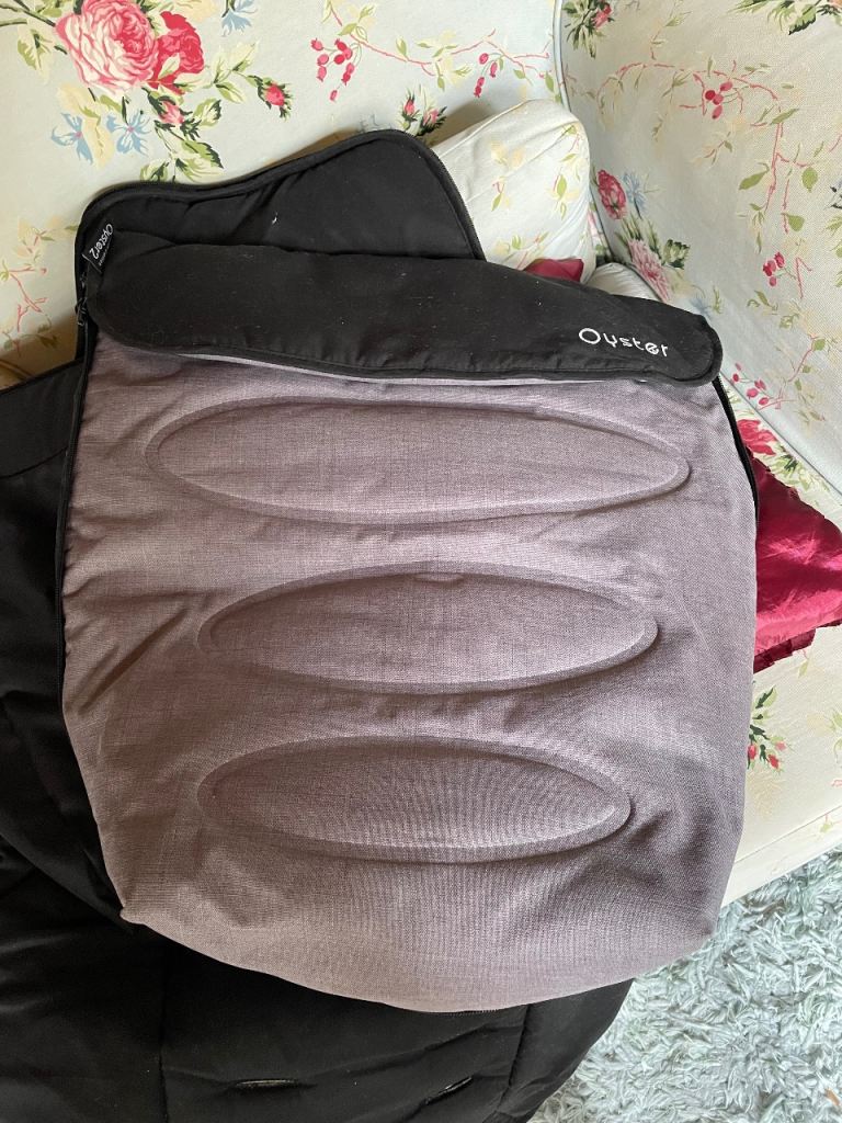 Oyster 2 pram, grey fabric pram with rain covers and several aprons and inserts. Beige fur liner for comfort & warmth. Good condition. Collection only