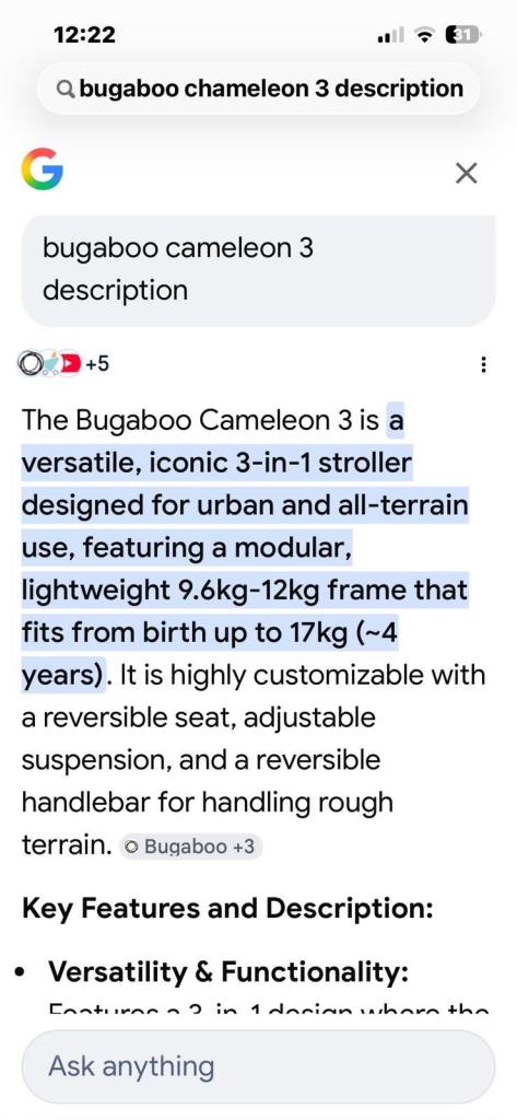 The Bugaboo Cameleon 3 is a versatile, iconic 3-in-1 stroller designed for urban and all-terrain use, featuring a modular, lightweight 9.6kg-12kg frame that fits from birth up to 17kg (~4 years). It is highly customizable with a reversible seat, adjustable suspension, and a reversible handlebar for handling rough terrain.