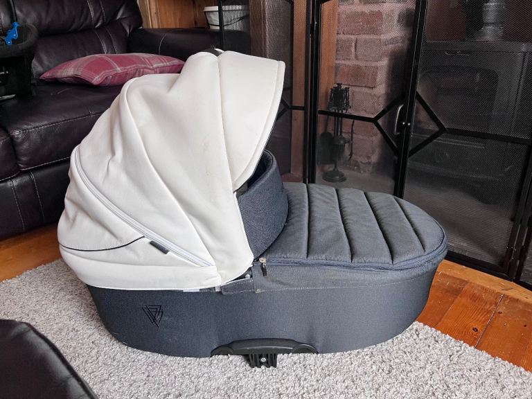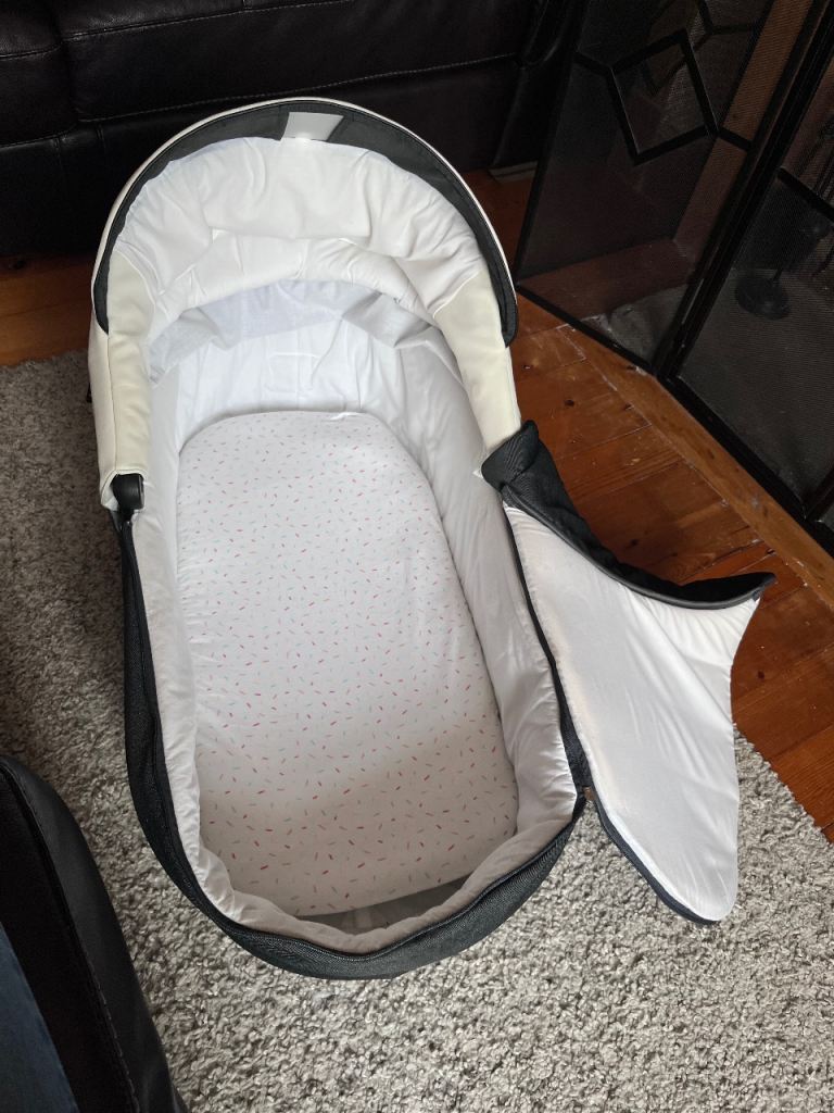 Chassis with bassinet, mattress and two sheets included. Bassinet can be adjusted to place baby on incline. Removable cover.