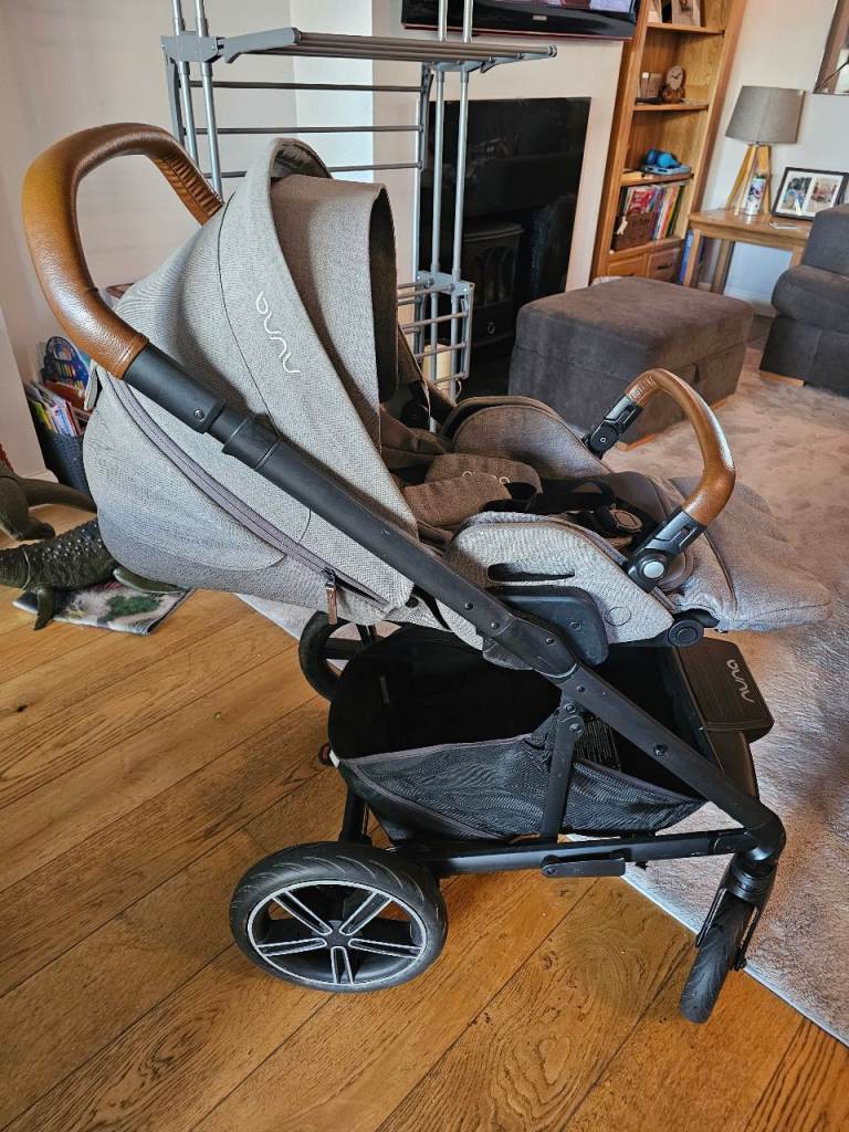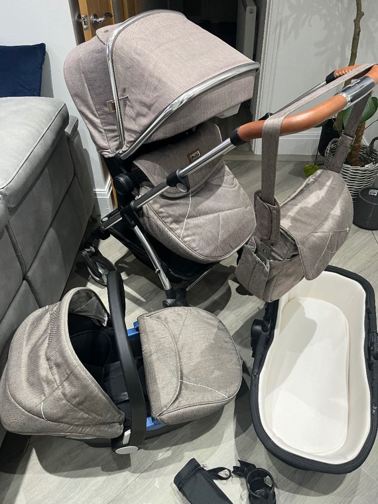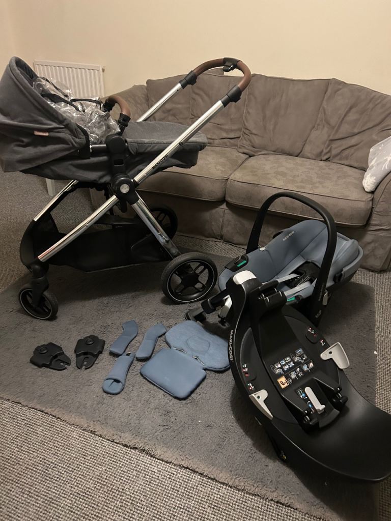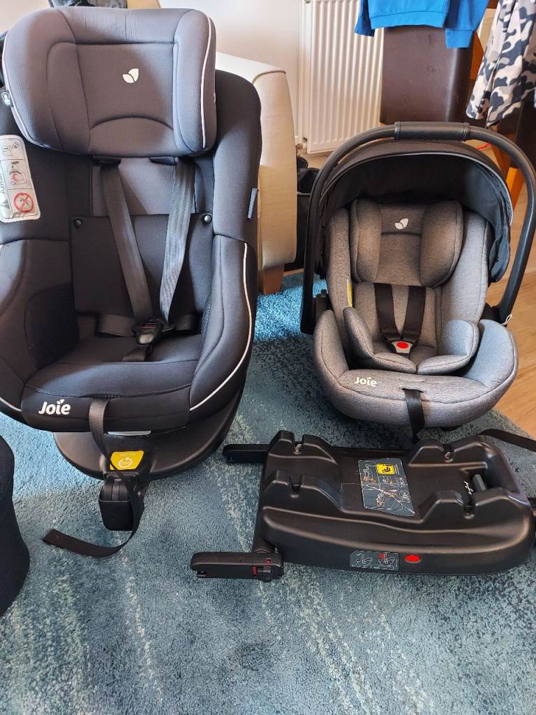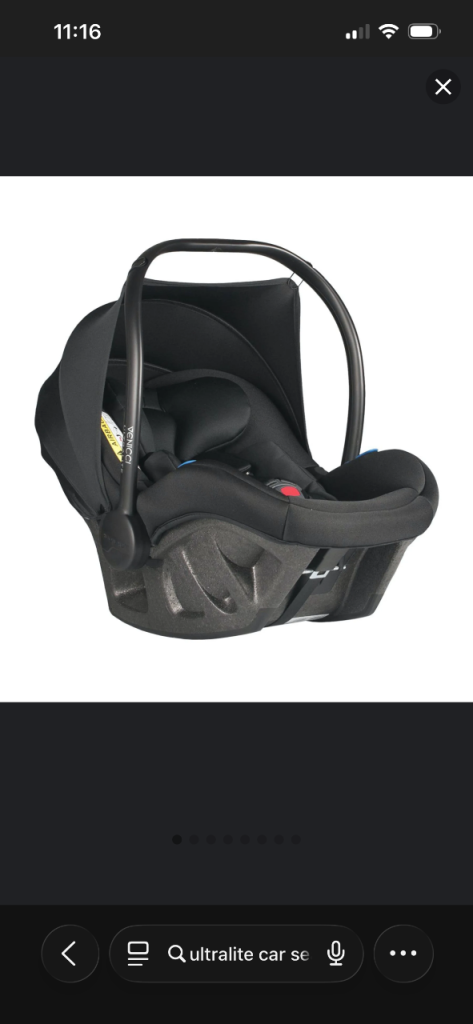 Ultralite car seat with newborn insert can be placed on isofix base (separate purchase) or secured using seatbelt. Has adapters so can be placed on pram chassis.