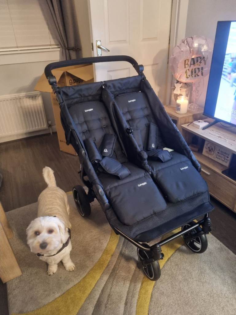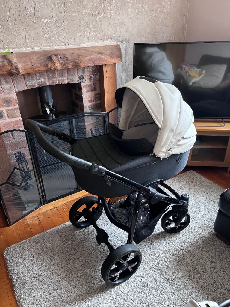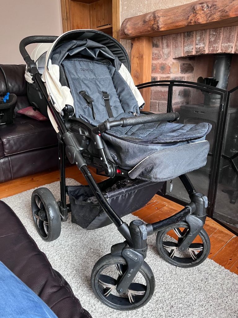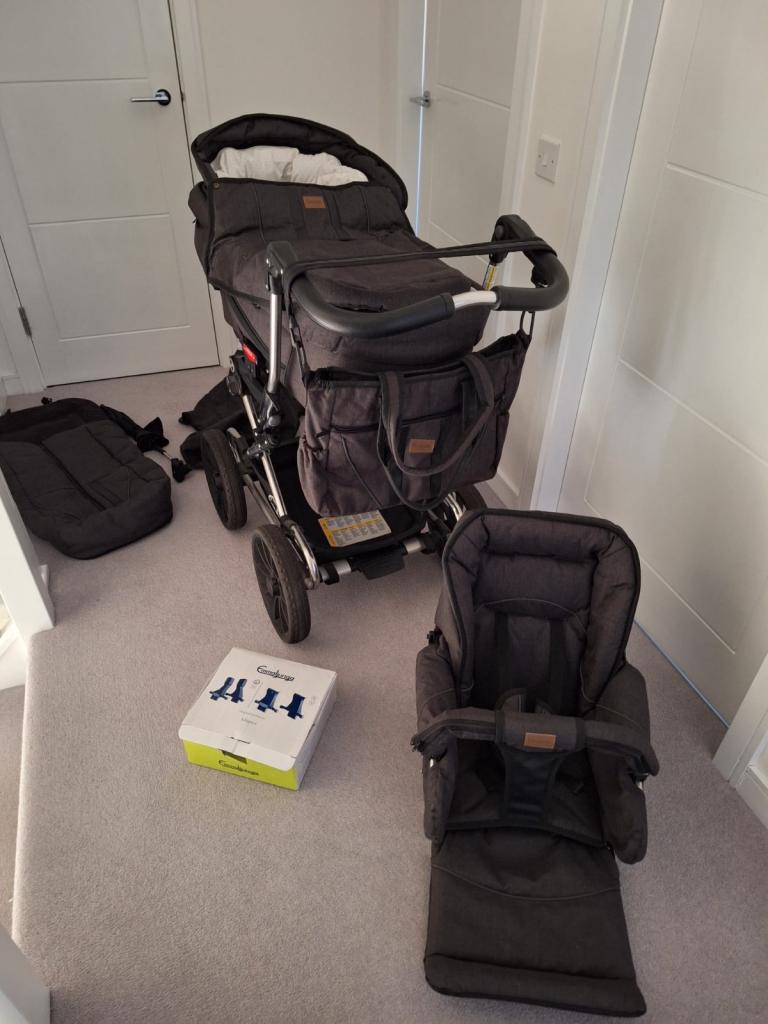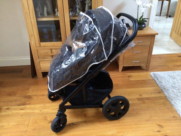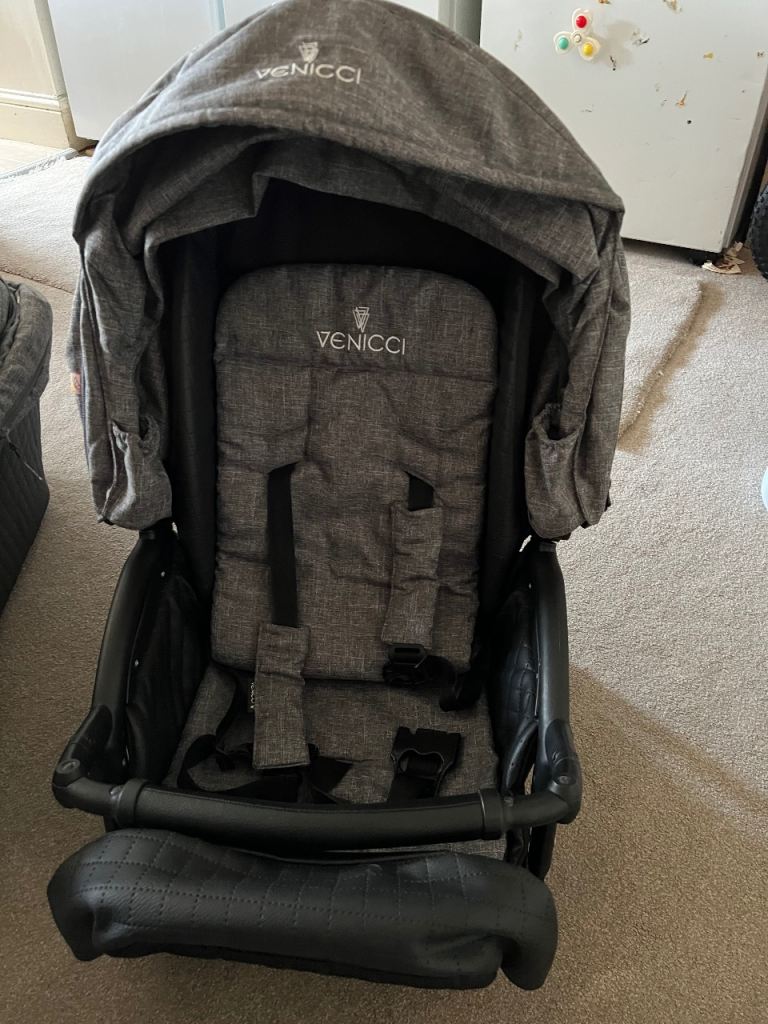 Seat unit which has an adjustable recline, removable bar, adjustable foot rest. Comes with Footmuff which can be removed. Padded straps. Adjustable hood with extending panel and vent. Hood has sun protection.