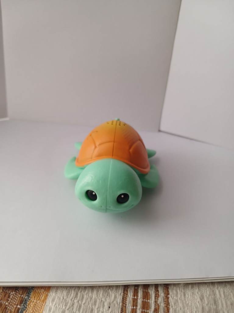 This is an adorable, interactive sea turtle toy designed with a vibrant, friendly aesthetic. It features a soft, mint-green body with large, expressive black eyes and a gentle smile. Its shell is a striking "sunset" orange that fades beautifully into a deeper golden-yellow near the edges.