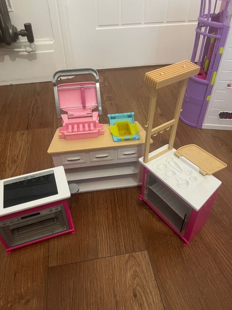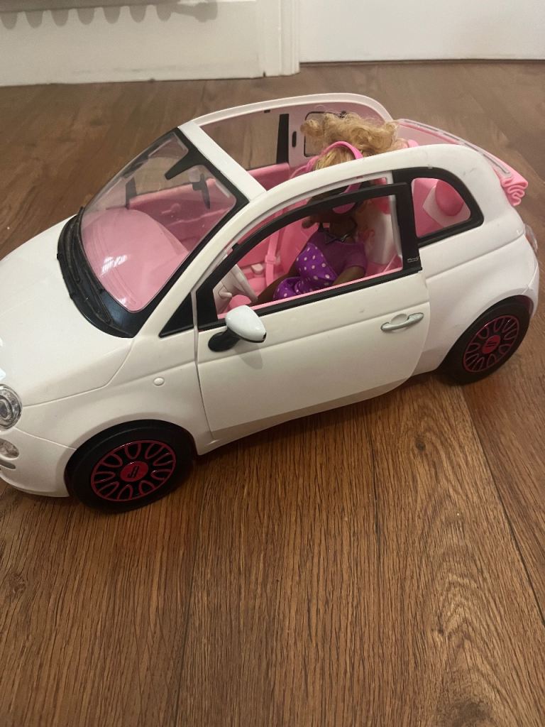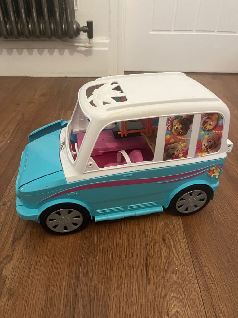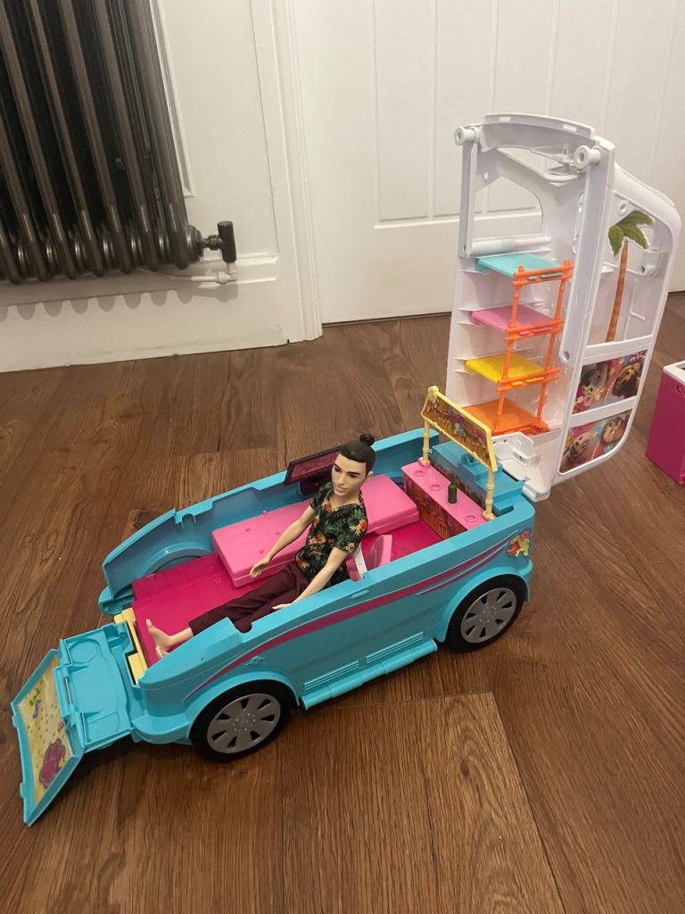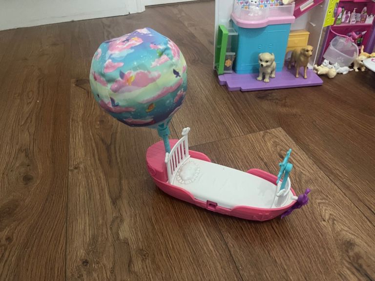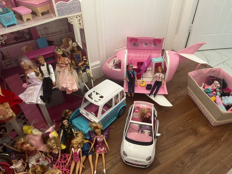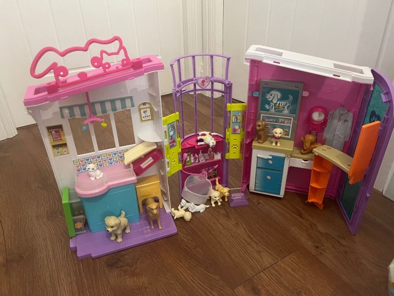Barbie house with aeroplane, fiat 500, camper van, dog groomers accessories