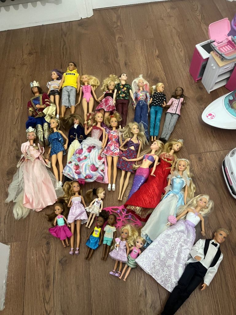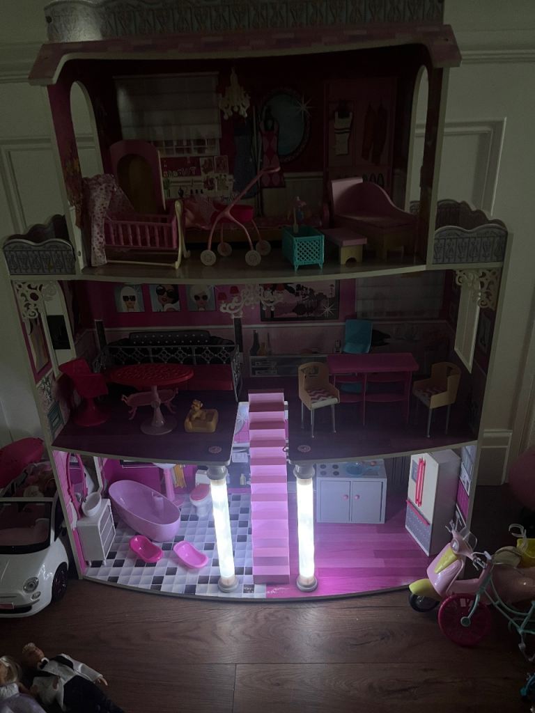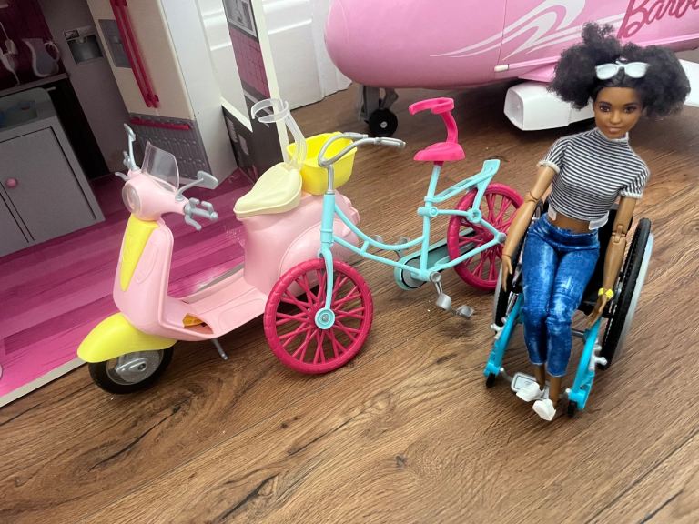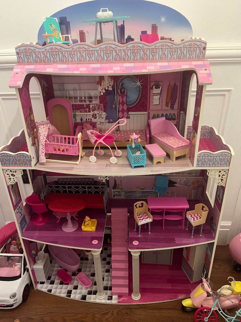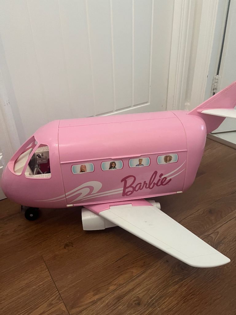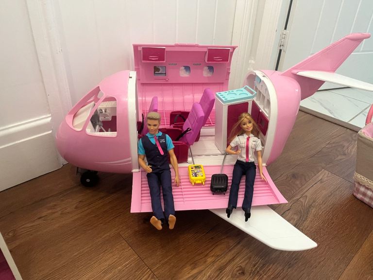 Barbie house with aeroplane, fiat 500, camper van, dog groomers accessories