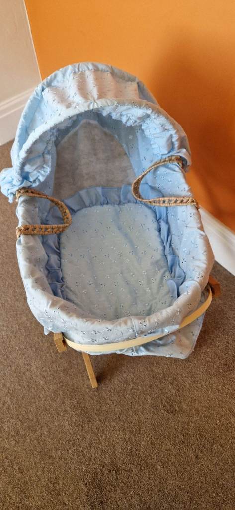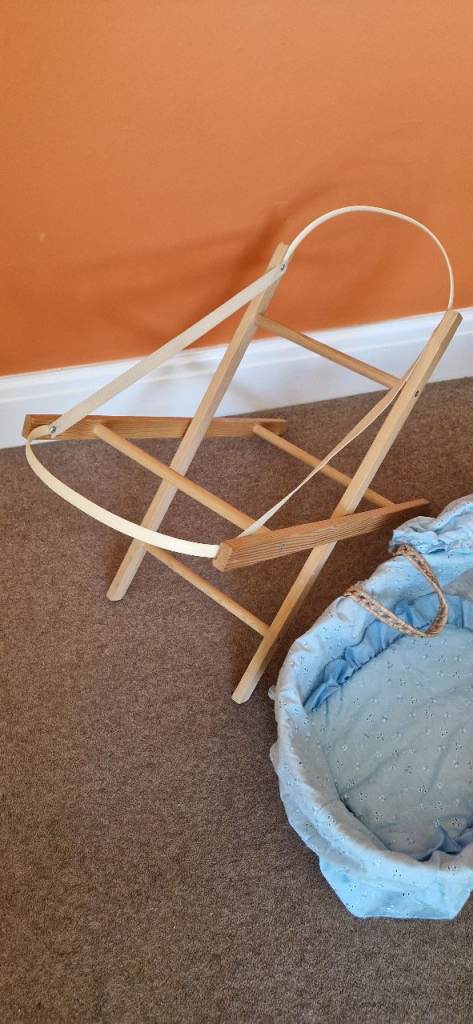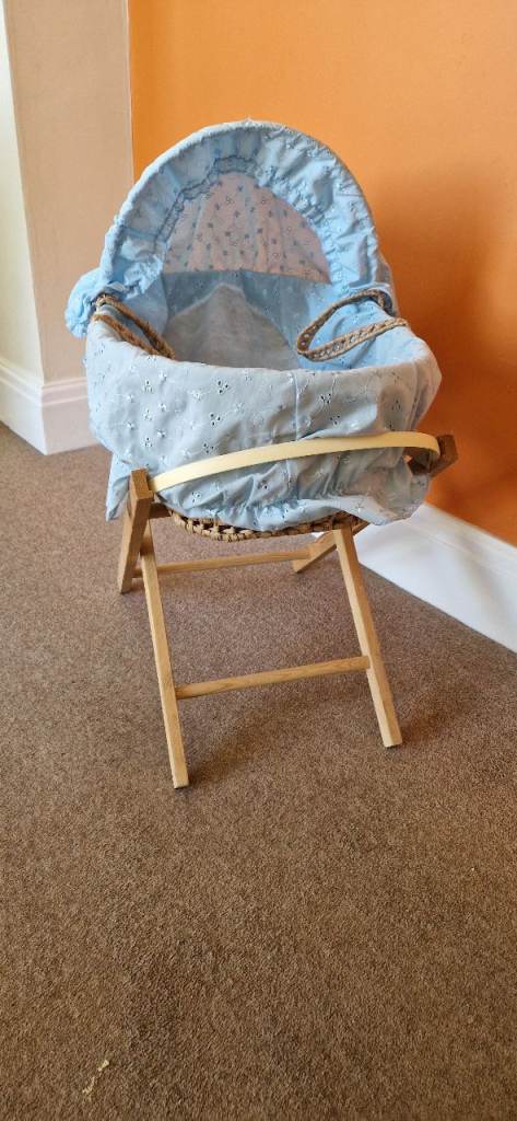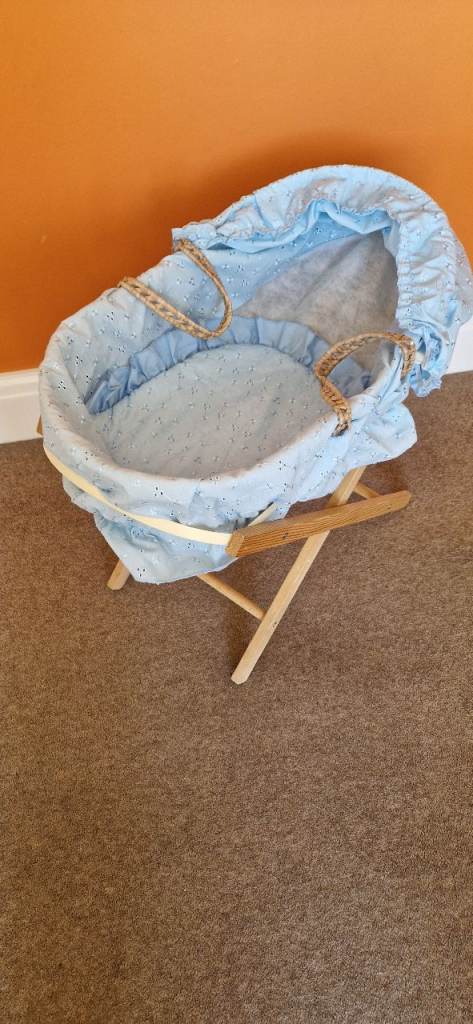 PLEASBABY DOLL MOSES BASKET WITH STAND. IN EXCELLENT CONDITION.E NOTE.