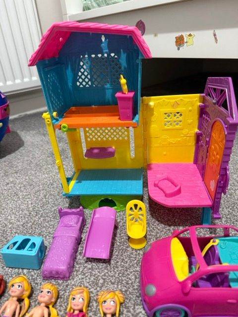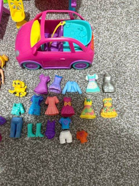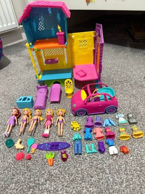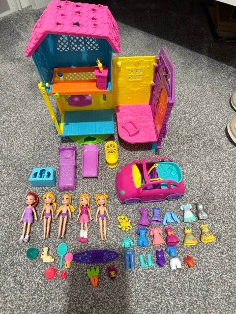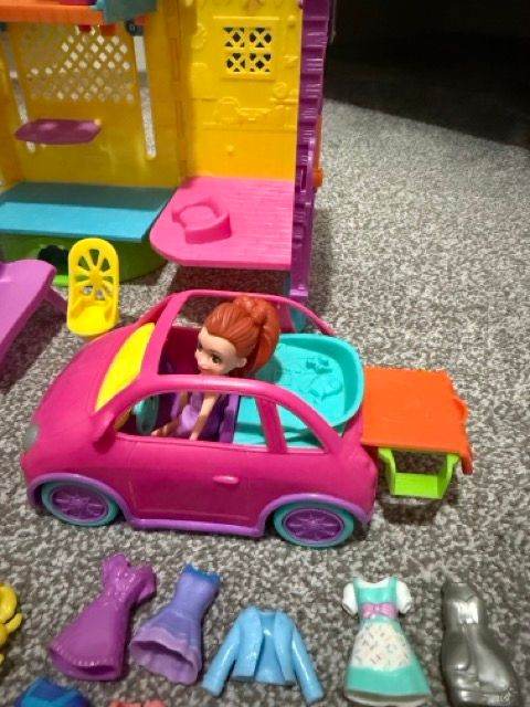 Includes doll house, **5 dolls**, car, furniture, clothes and accessories as shown in photos.