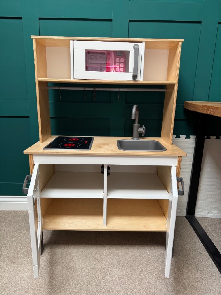 IKEA role-play kitchen in excellent condition, three adjustable leg positions that grows with your child. Light up hob can be switched on and off also includes toy microwave.