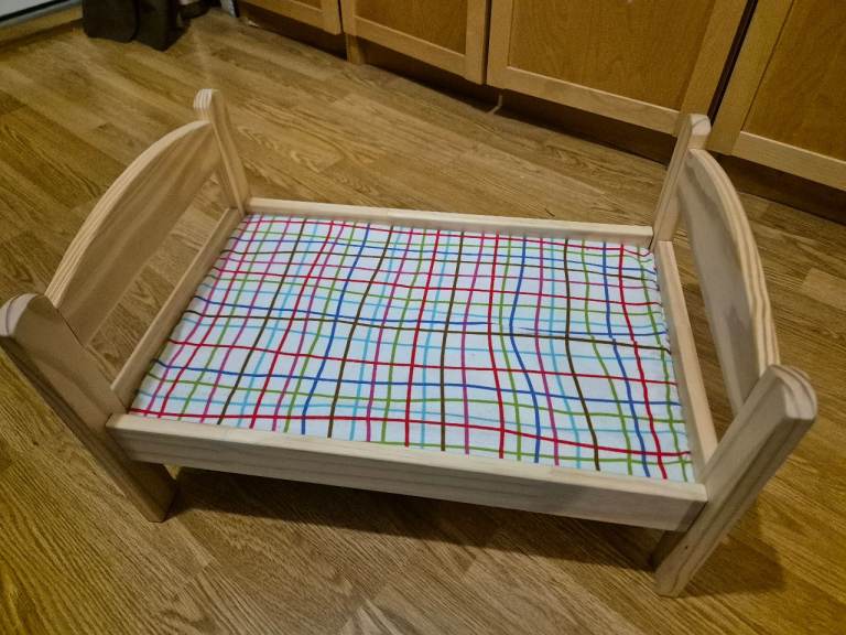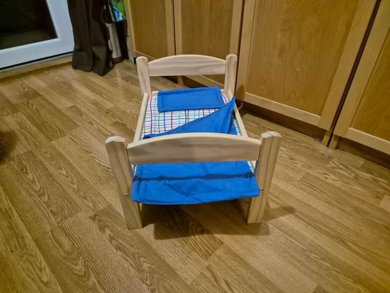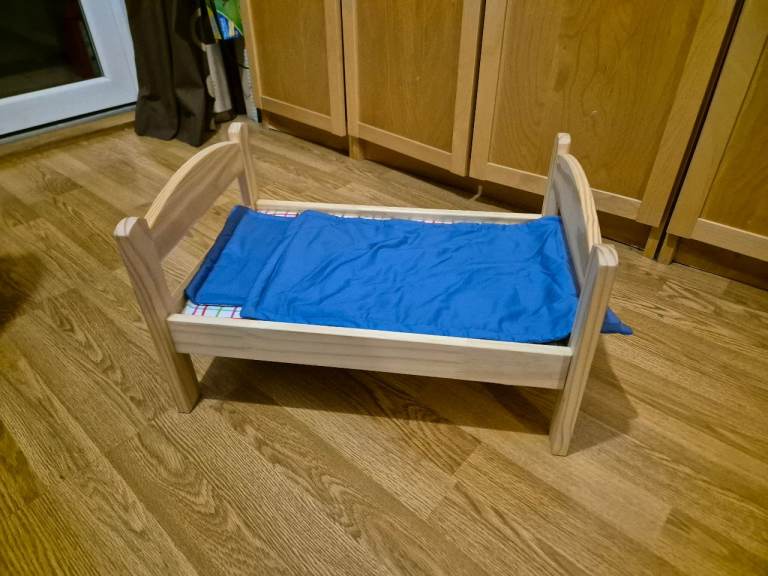 IKEA Wooden doll/teddy bed with bedding (for imaginative/role play)