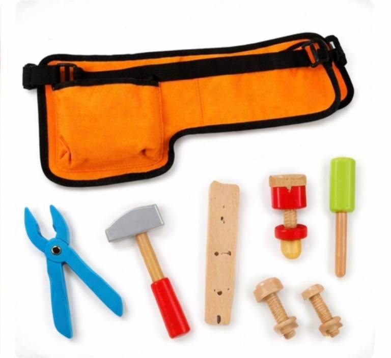 This sturdy and colourful set includes a comfortable orange tool belt with adjustable strap and a selection of wooden tools designed especially for small hands.