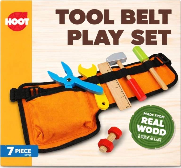 Kids Wooden Tool Belt Play Set – 7 Piece Pretend Play DIY Kit (Real Wood)