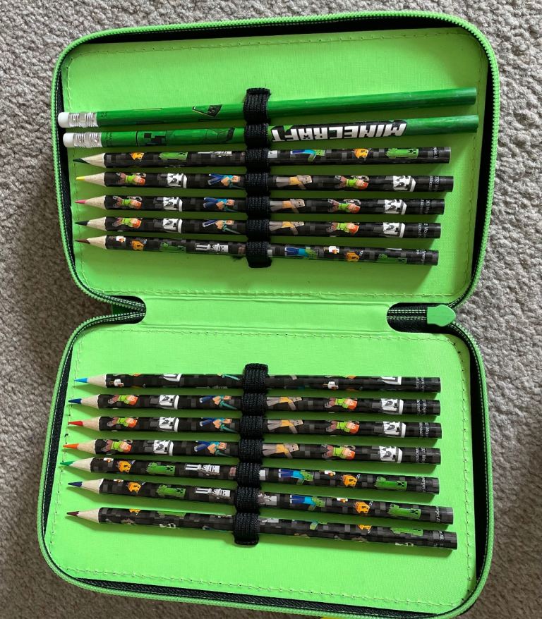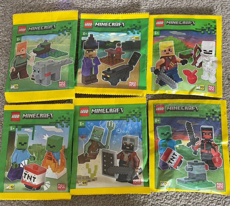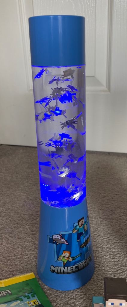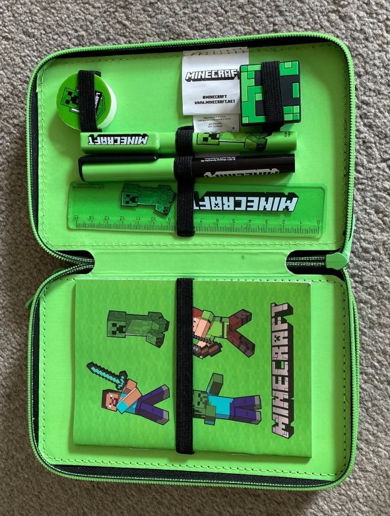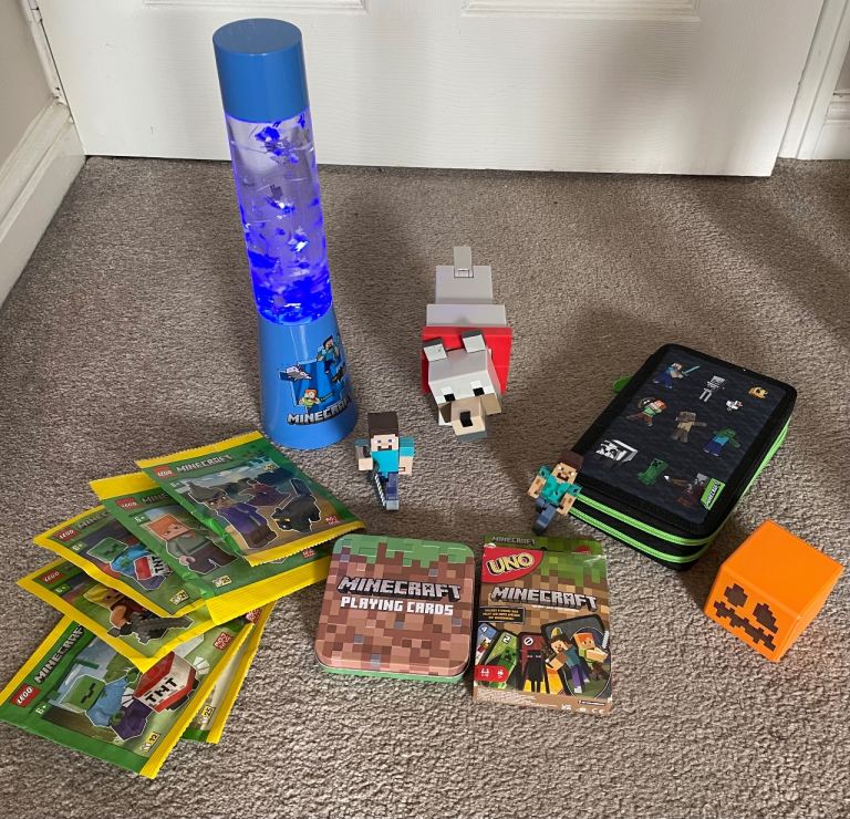 Minecraft bundle as photos, Lego figures unopened, stationery set unused, working lamp.