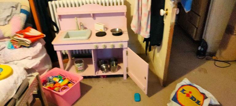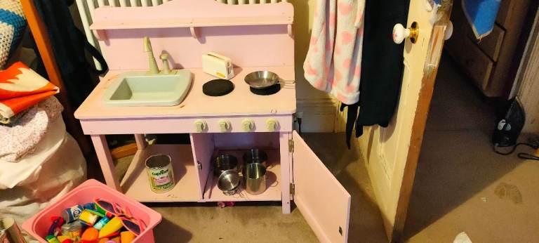 Wooden kitchen with a sink that pumps water. Cooking items shown and have plastic food items and plates/utensils. All in good working order. I have included the paint I used for a touch up if you desire ( suitable on children's items). My grandchild had many hours of fun