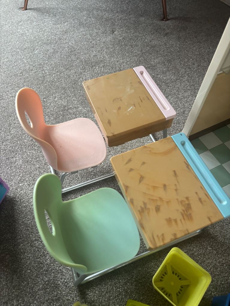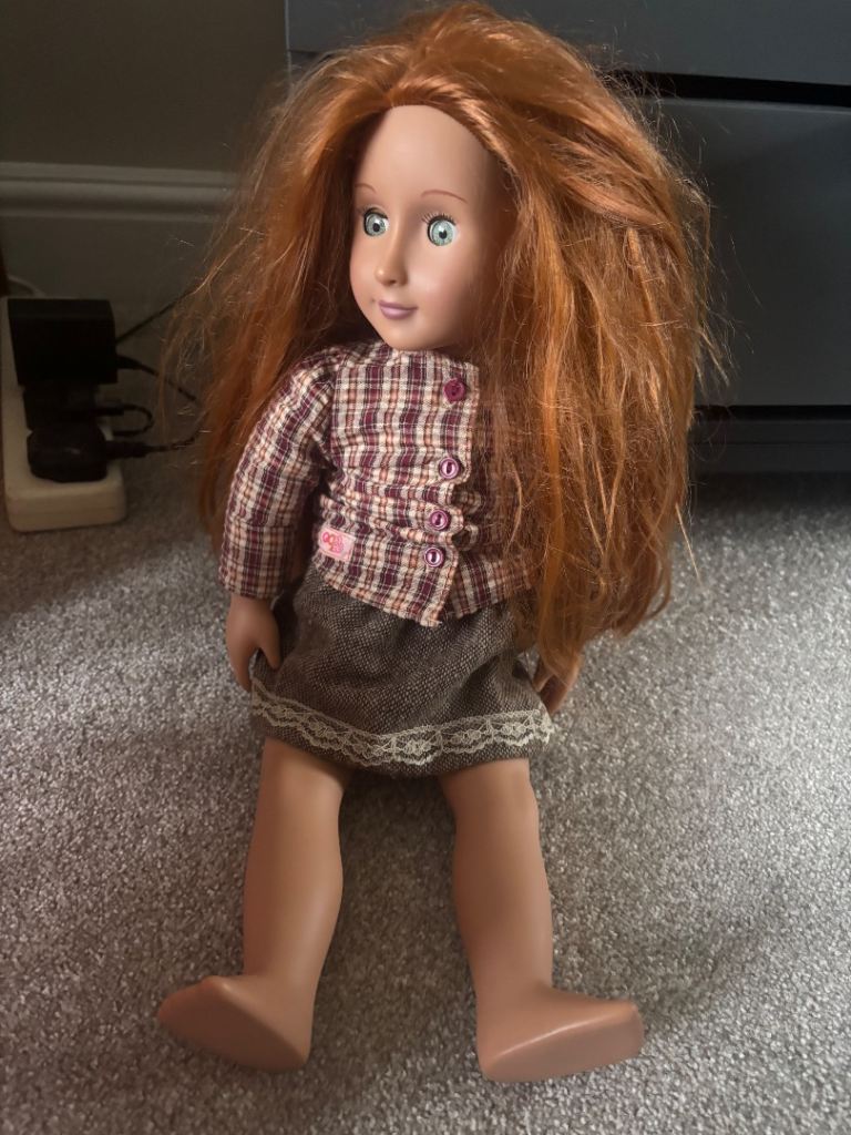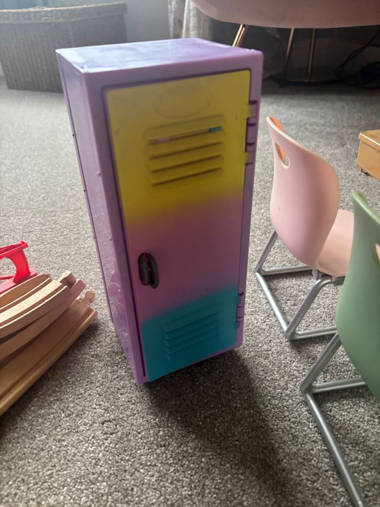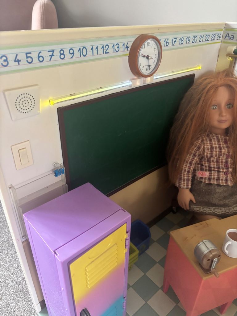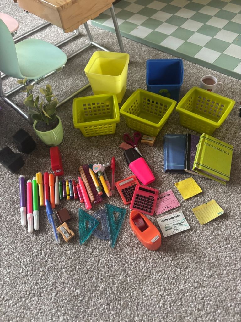 Working lights and bell. Plenty of miniature stationary. Books included but have been written on in places. Teacher doll.