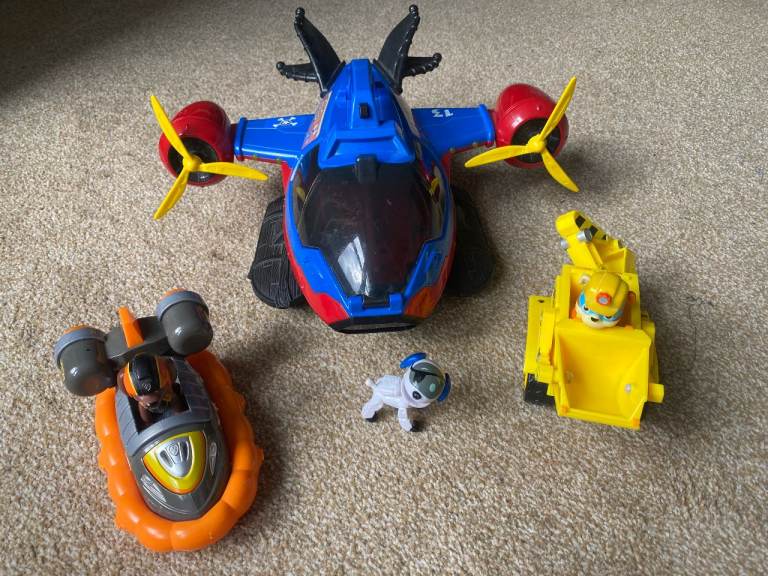 Paw patrol air patroller by Spin master. Rubble, Zuma plus tip truck and hovercraft. Also Robo-dog (has paw missing - see photo). Staple Hill collection only.