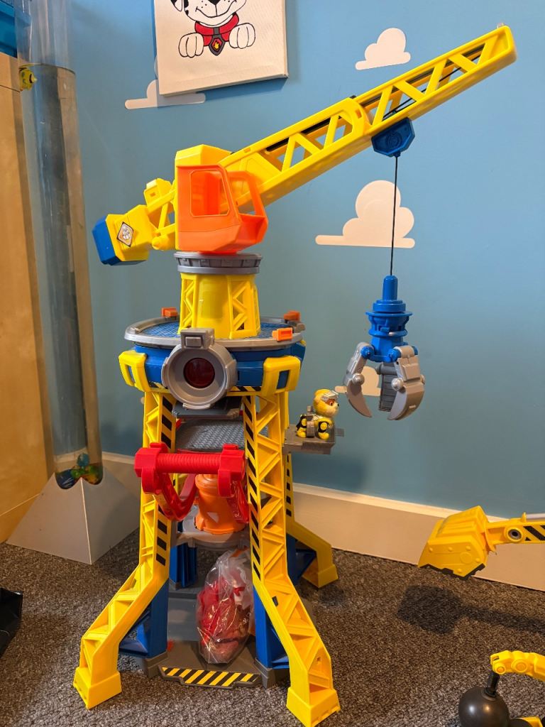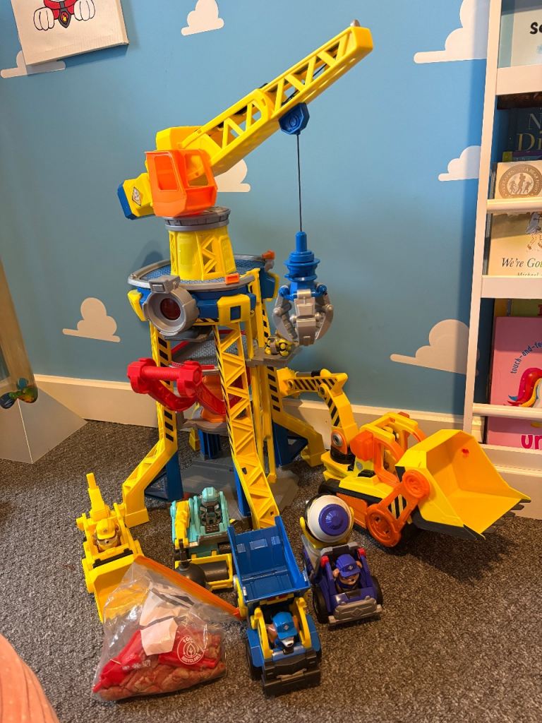 Paw Patrol crane set including the large vehicle, crane, and additional vehicles/figures. The crane and large vehicle both make sounds and work as they should.