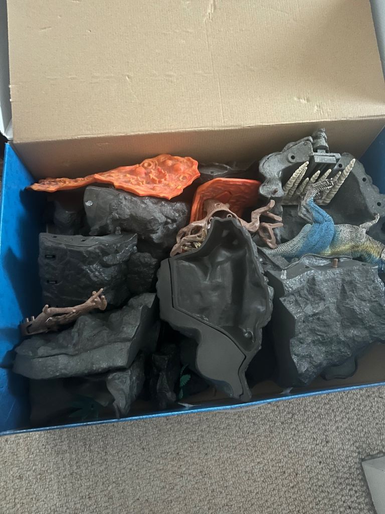 Dinosaur, volcano role play set. In original box. Non smoking/vaping and pet free household. Missing skeleton dinosaur, frog and flower.