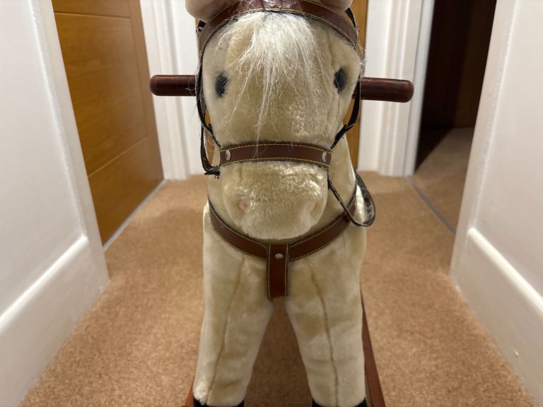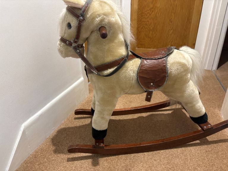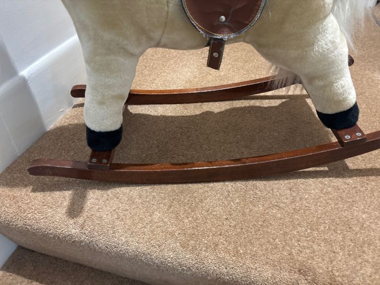 Soft fur. Good condition. Rocking horse for toddler. Wood base. Good condition. Press one horse ear button for trotting sound and press other ear for galloping. Grandchildren have grown too big for it. Only used when they came to see us. Lots of play value