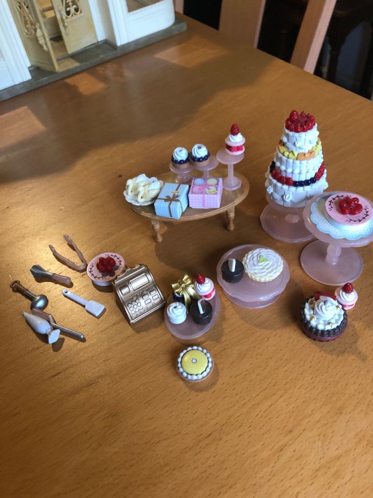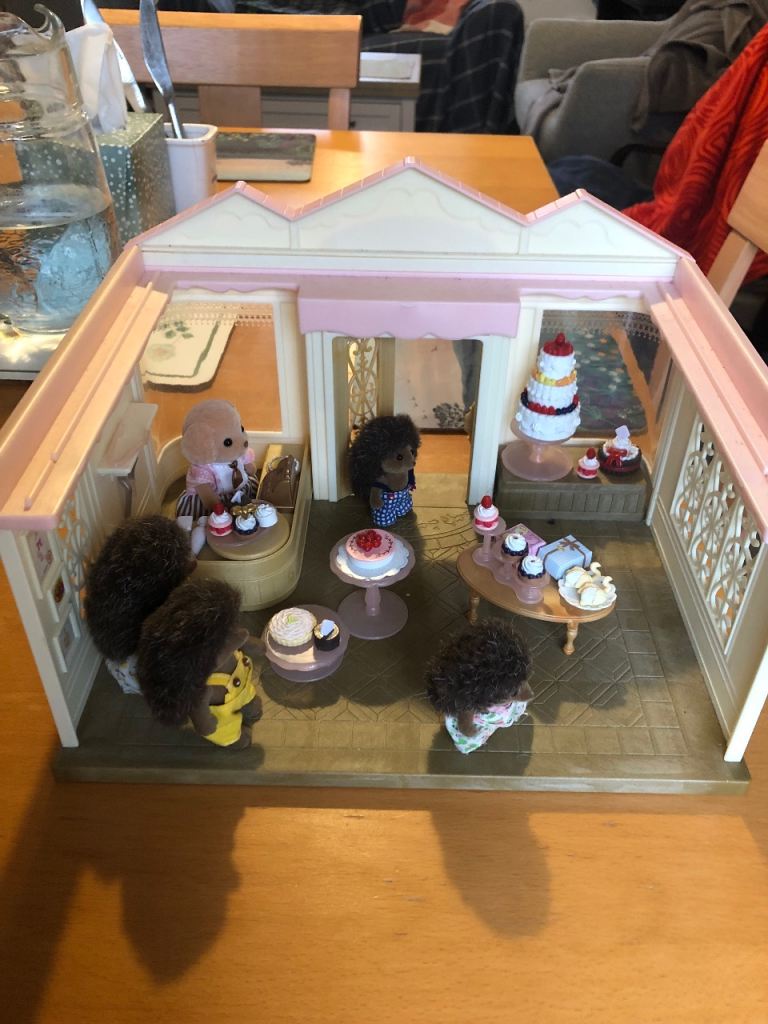 I am selling a Sylvanian families village cake shop, which includes all the items shown in the picture with the dog shop assistant and additional hedgehog family. It is in excellent condition.