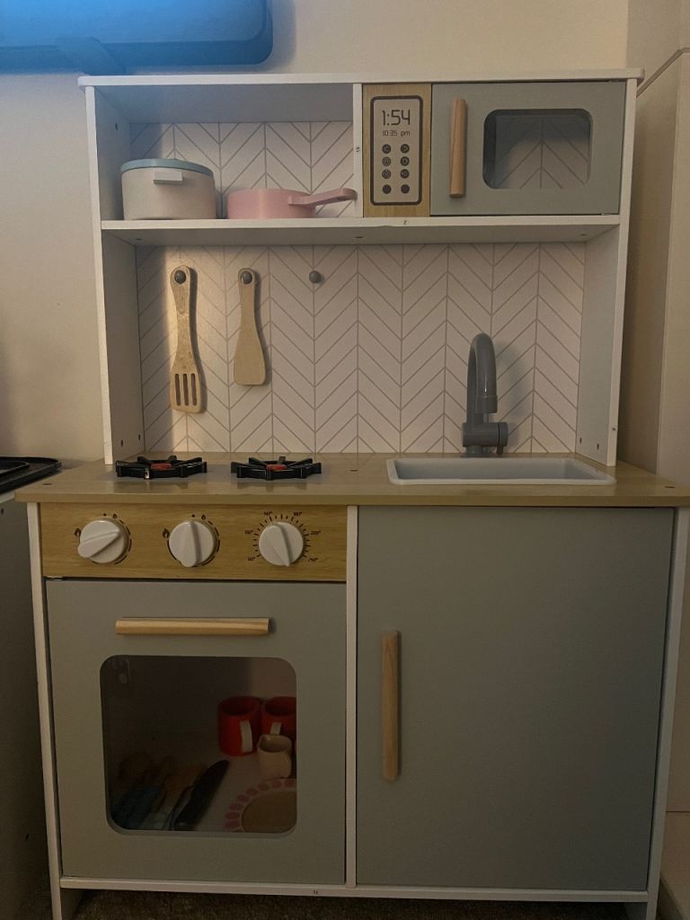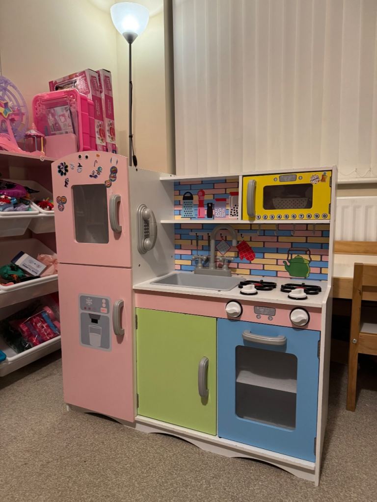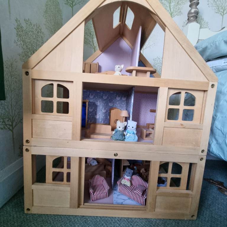 A beautiful wooden dolls house with lots of extra furniture and figures. Dimensions are 80cm high, 62cm wide and 35cm deep
