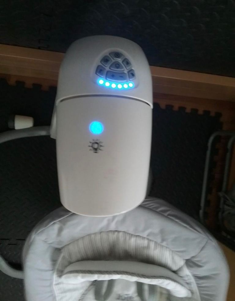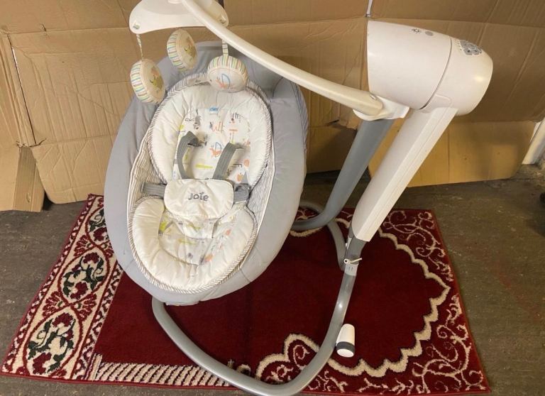 Joie Swivel swing, a swivelling, swaying seat soothes littles from birth on. 2 way reclining seat, vibration and sounds for a peaceful nap time, anytime.