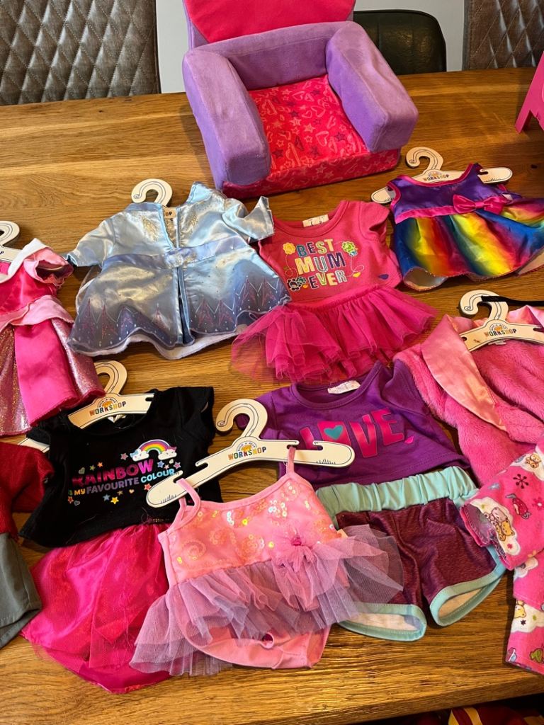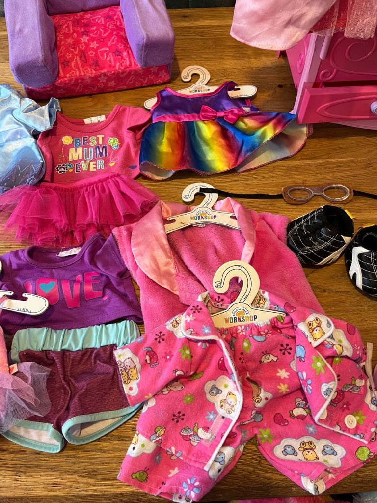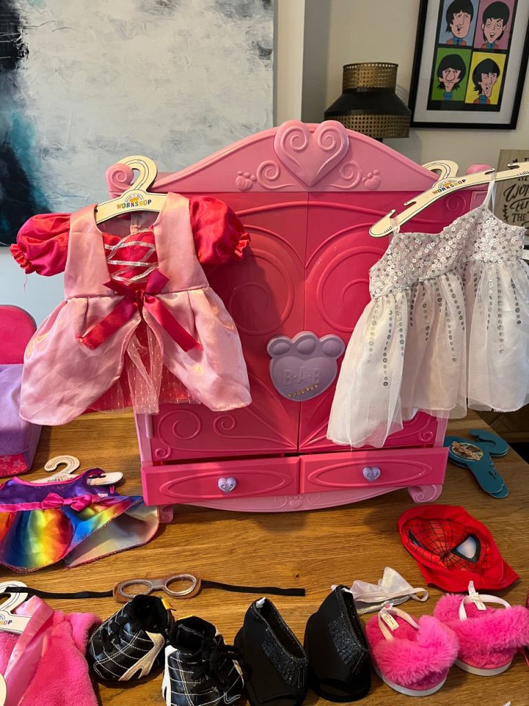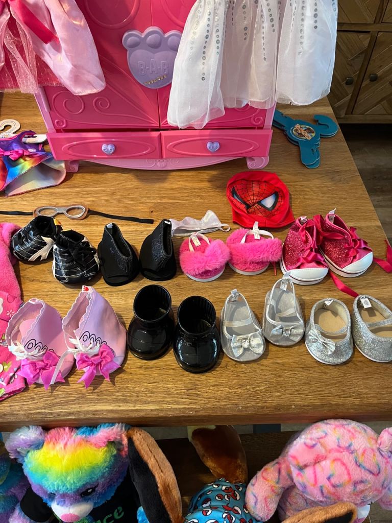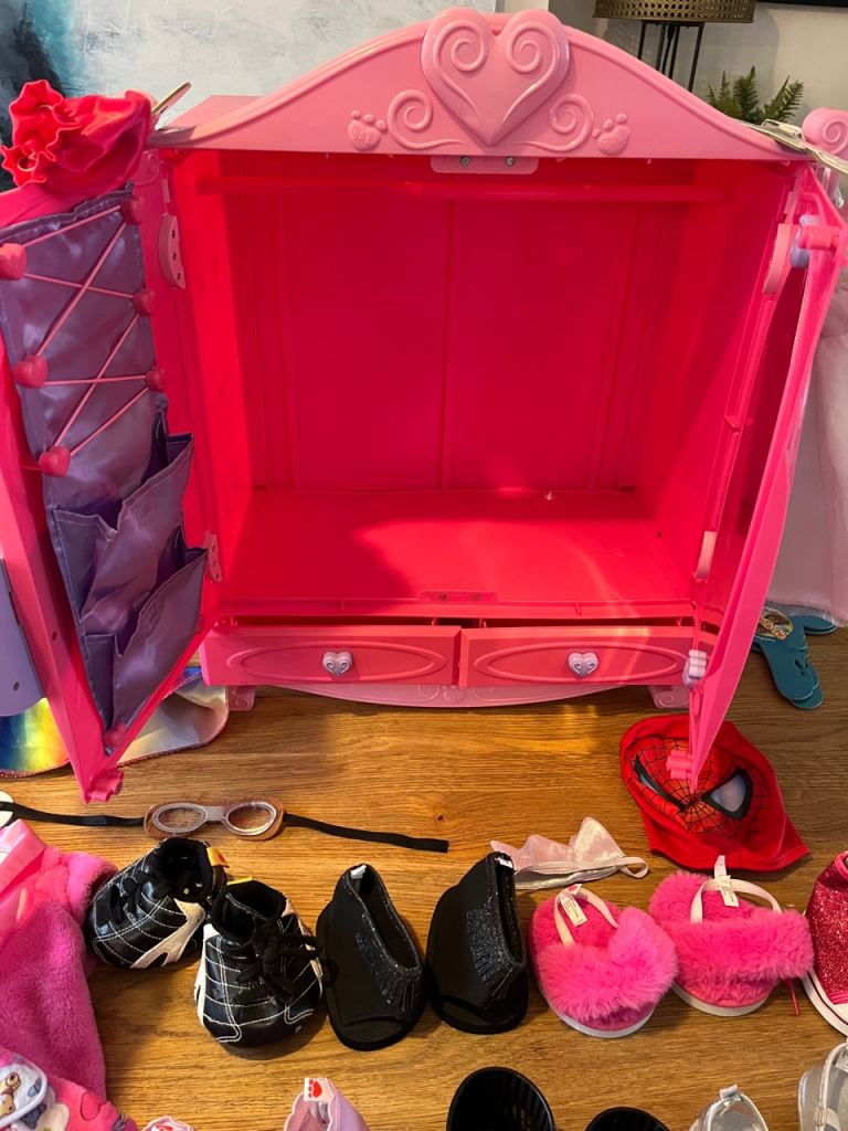 Large build a bear bundle including wardrobe, chair, clothes, hangers, shoes and bears.