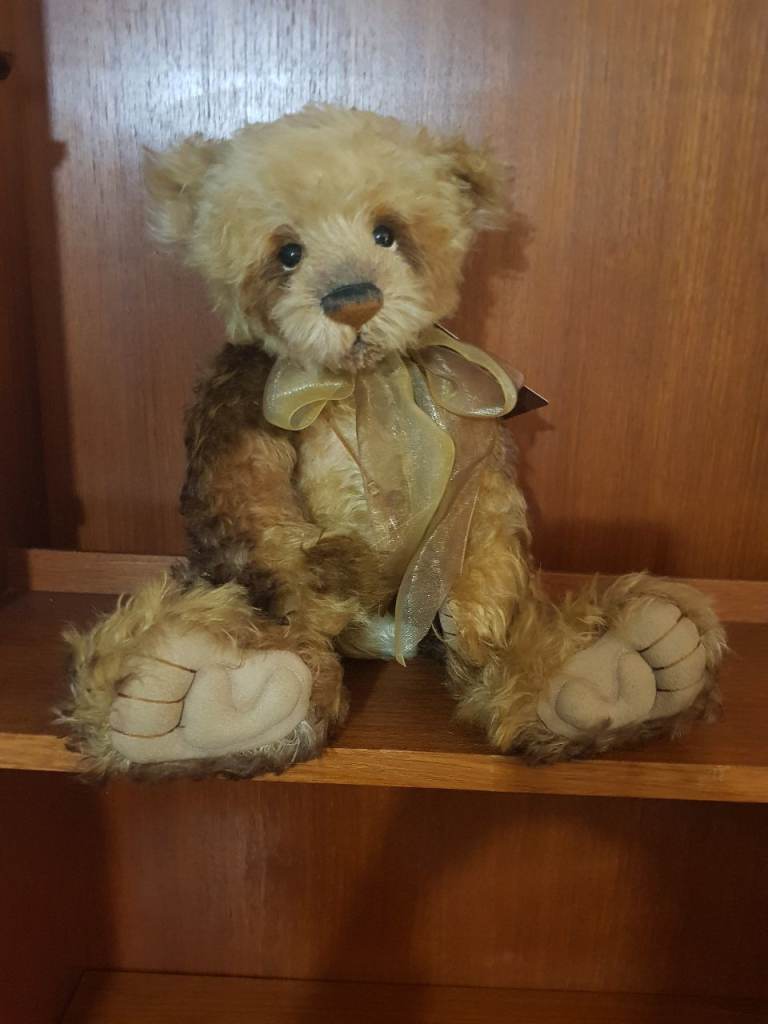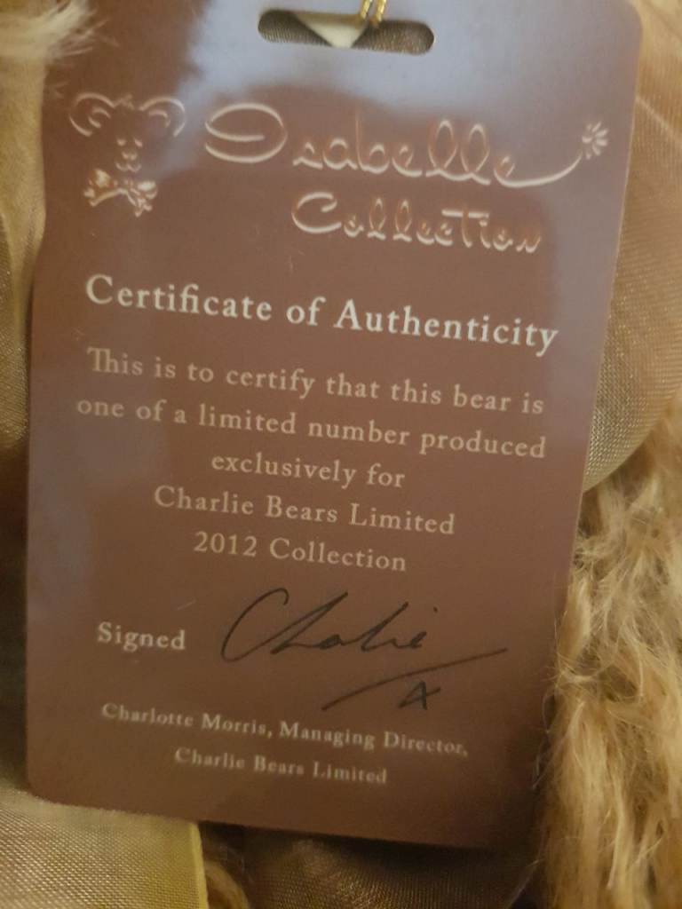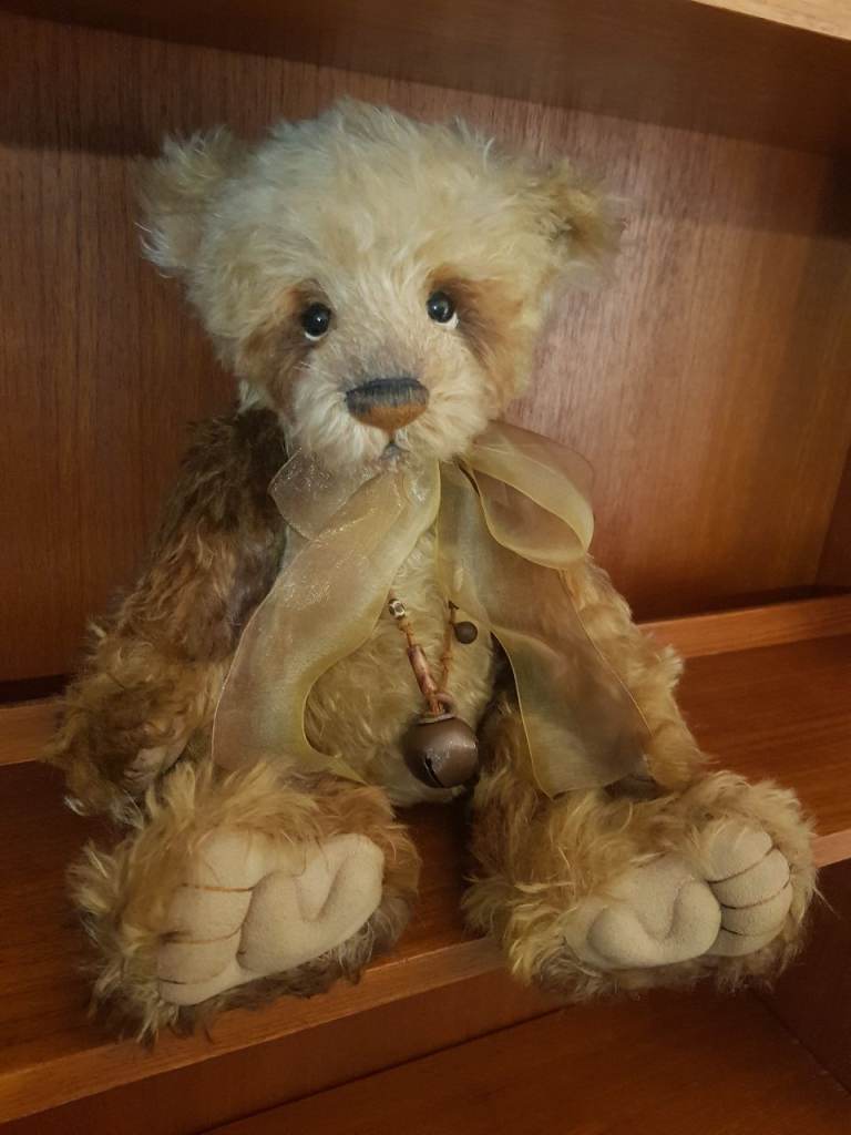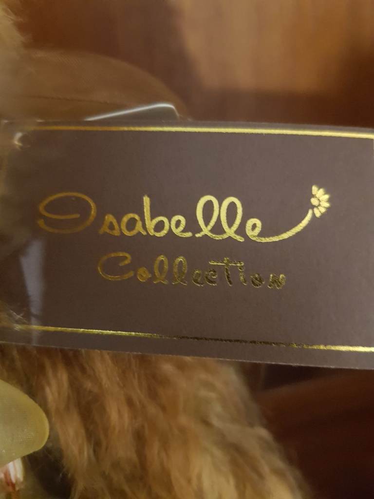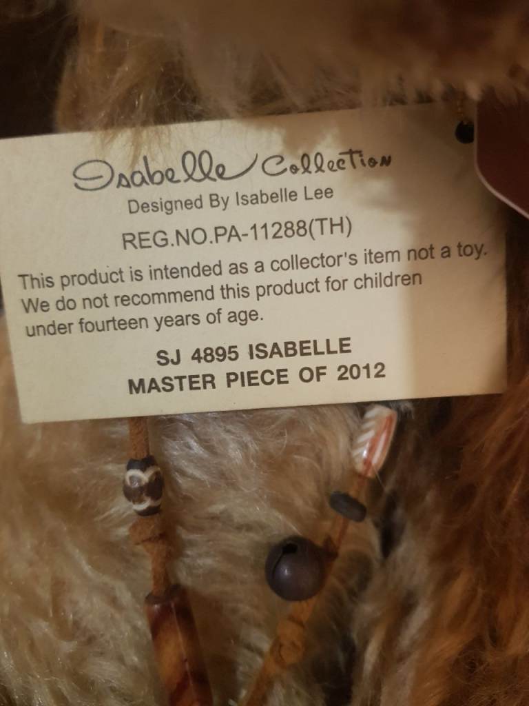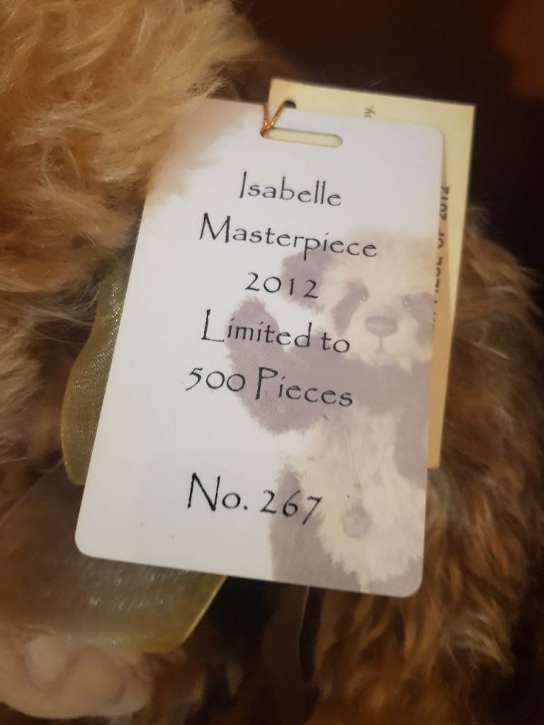 Isabelle lee masterpiece 2012. No 267 out of 300. 100% mohair. Approx 17 inches x 9 inches. Various shades of brown and blond mohair. Necklace with bell and gold bow. Absolutely stunning bear.