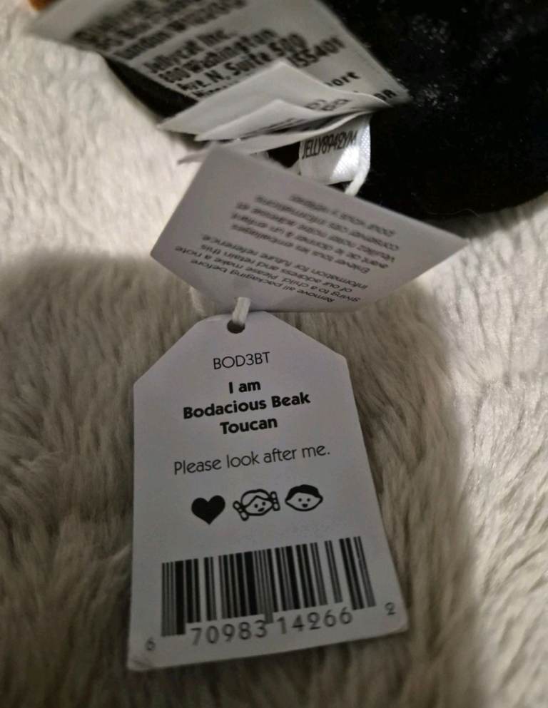 jellycat bodacious beak touchan with paper tags still attached. also another jellycat touchan? we bought the one with the tags so can confirm its genuine from our local stockist the other was a gift a while ago it doesnt have his paper tags and Im not sure who he is.