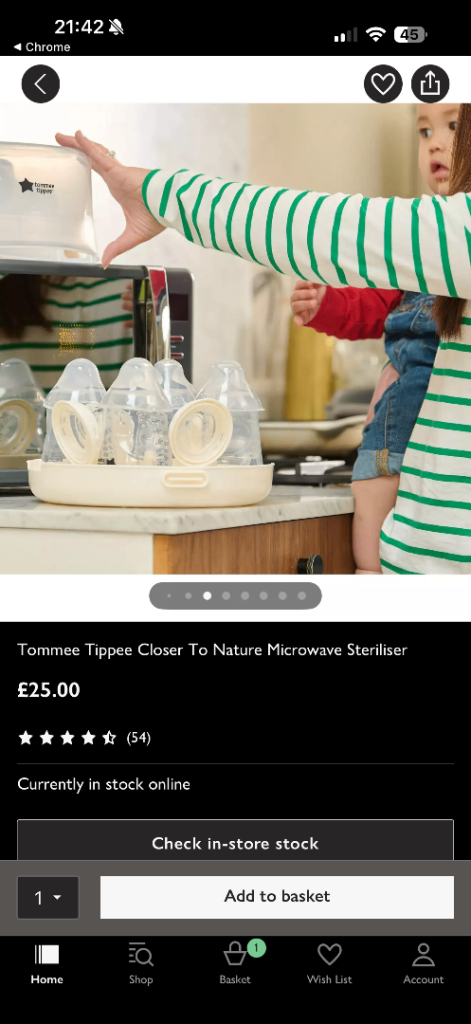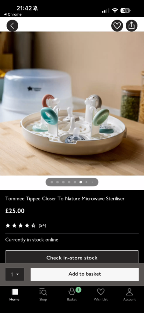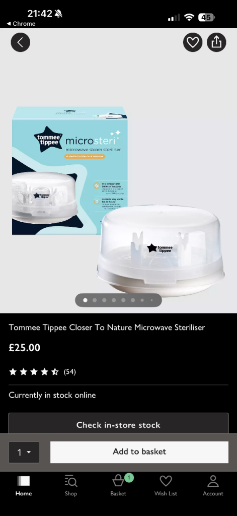 The Closer To Nature Microwave Steriliser from Tommee Tippee keeps everything in it sterile for up to 24 hours if you keep the lid closed, so you can switch it on at bedtime and wake up to sterile bottles for more relaxed breakfasts.