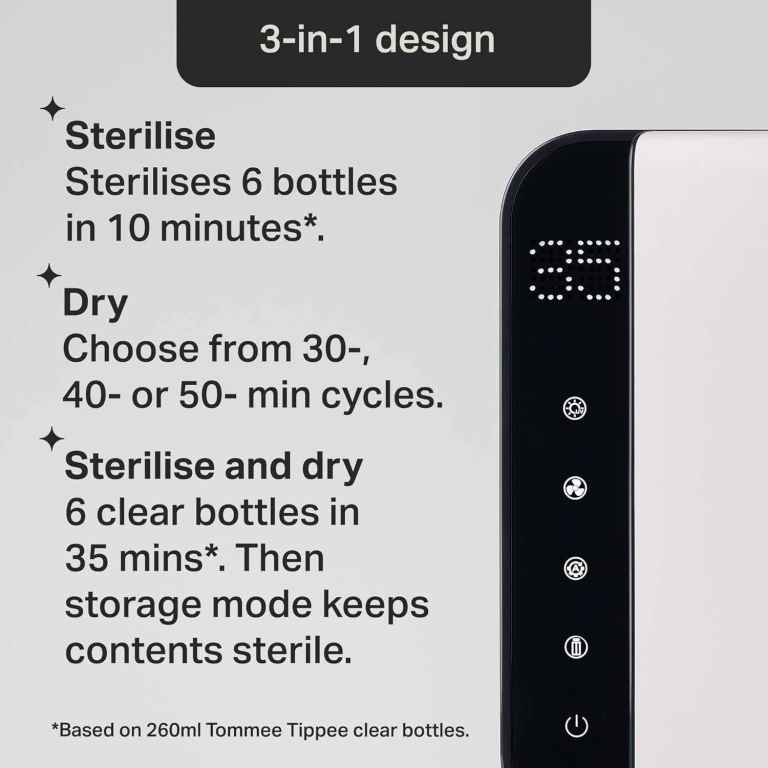 Our best steriliser. Expertly engineered to be safe for them, simple for you. UV light sterilises and dries everything you need to feed, fast. No water, no steam, no noise. UV lights kills 99.9% of harmful bacteria Sterilise and dry six clear bottles in 35 minutes No need for harsh chemicals, heat or steam Energy efficient Fits most brands of bottles. External lab report on testing sterilisation times for clear and coloured baby bottles
