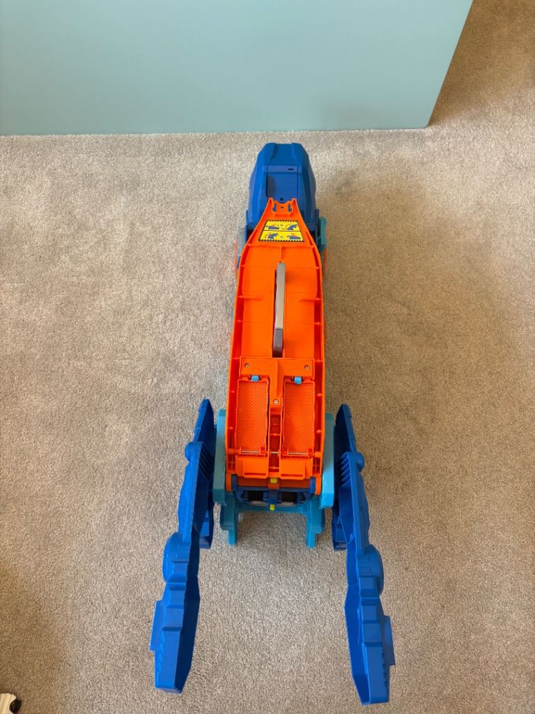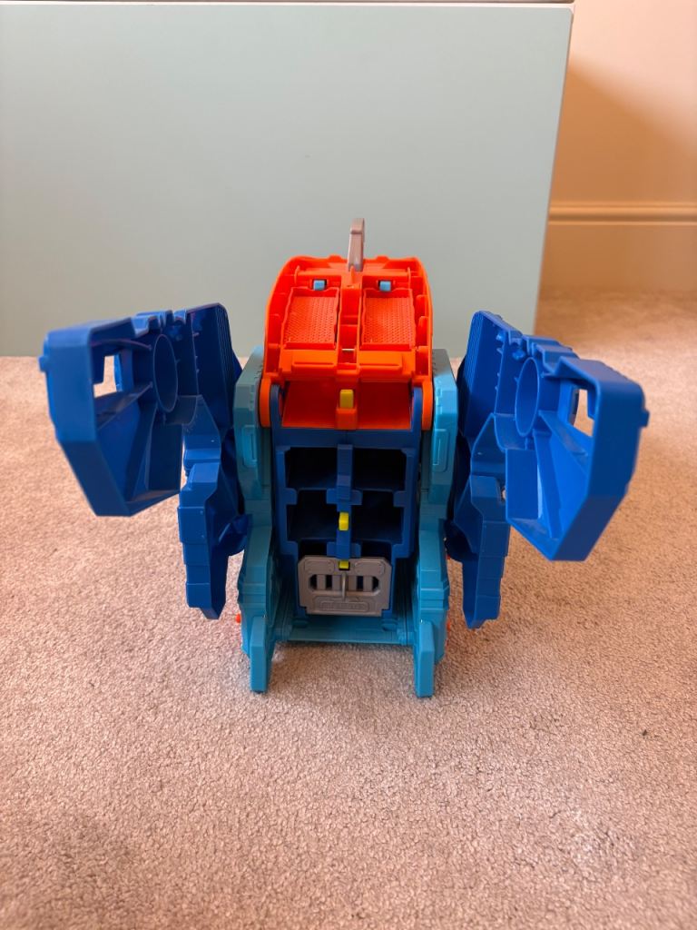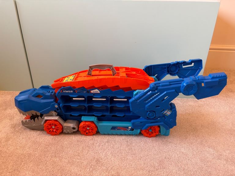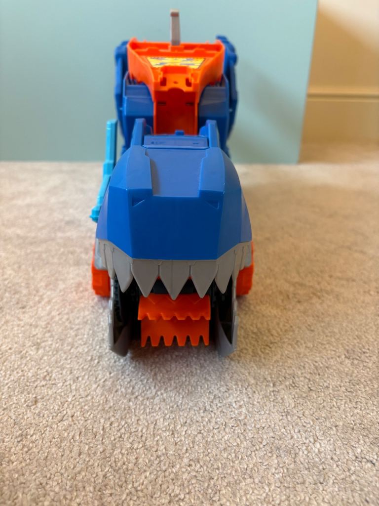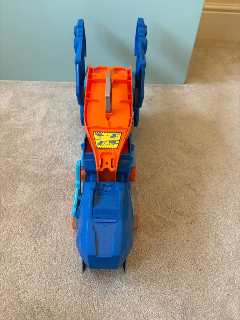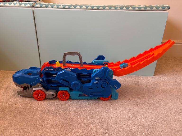 Lower the tail and it transforms into a Robo T-Rex with lights and sounds and a two-lane racetrack. Kids can also launch cars from its mouth! Two 1:64 scale Hot Wheels cars are included. Additional vehicles sold separately