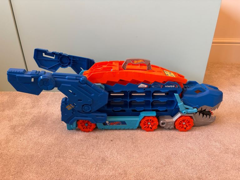 The Hot Wheels City Ultimate Hauler can gobble up and haul more than 20 1:64 scale cars and then transform into a growling, stomping T-Rex with a racetrack on its back! In hauler mode, pull it by the handle and watch it eat the 1:64 scale cars in its path.