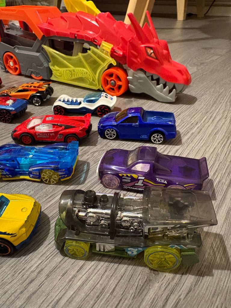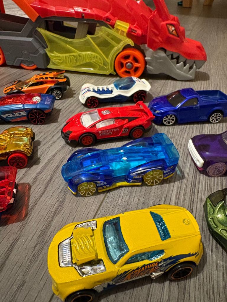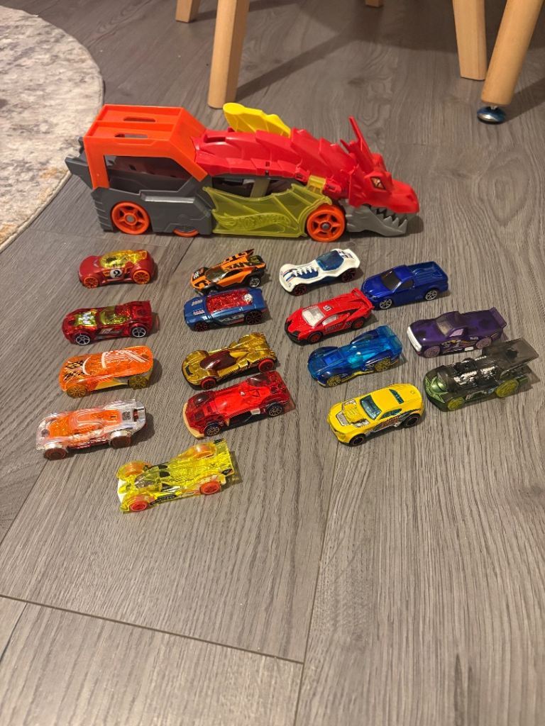 1 X Hot wheels dragon truck car carrier that shoots out cars and can attaches to the track.