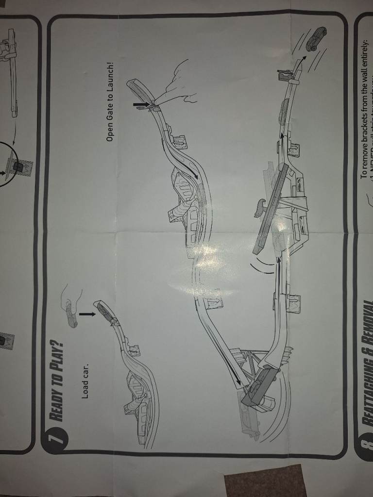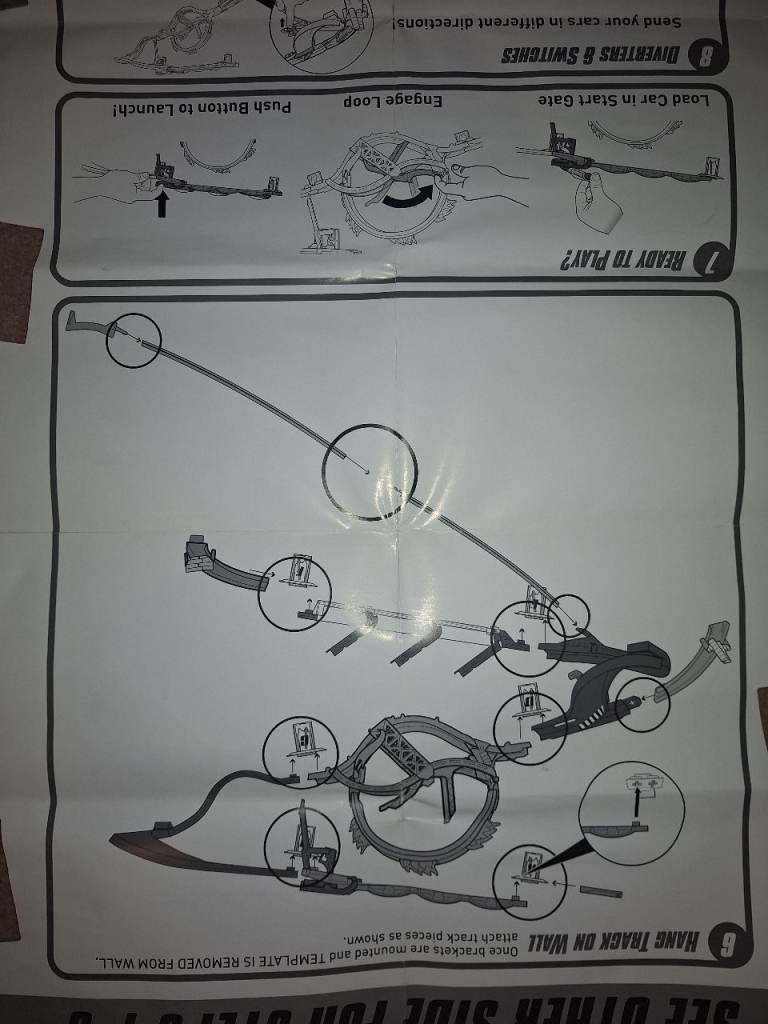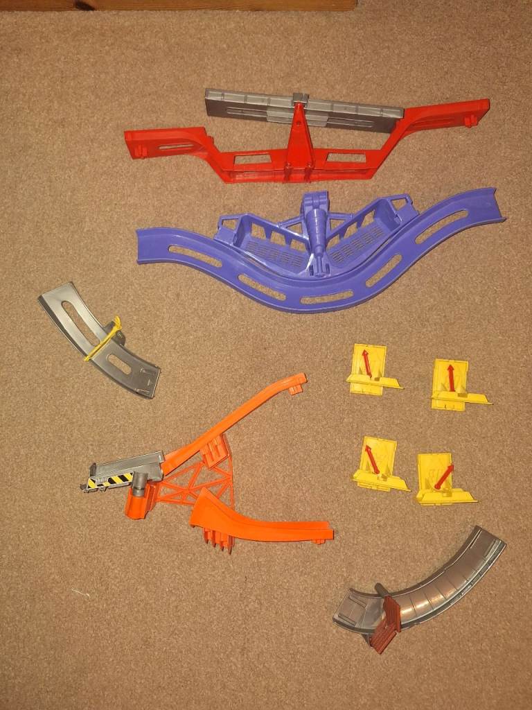 We are selling the Starter Set and Daredevil Curves kits together. They are both in excellent condition and complete, including the hanging templates. All that is needed are new command strips to hang them on the wall. They are great fun, and take up much less floor space than traditional Hot Wheels sets!