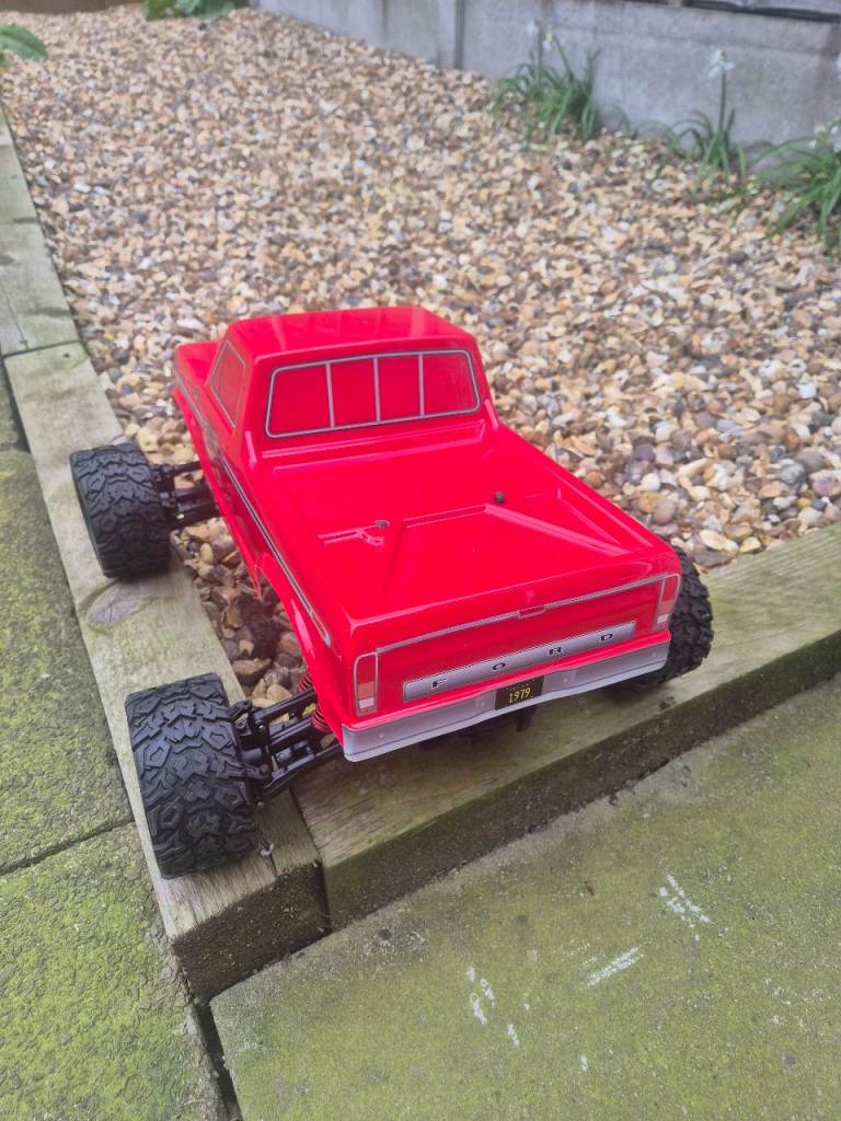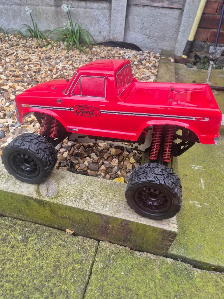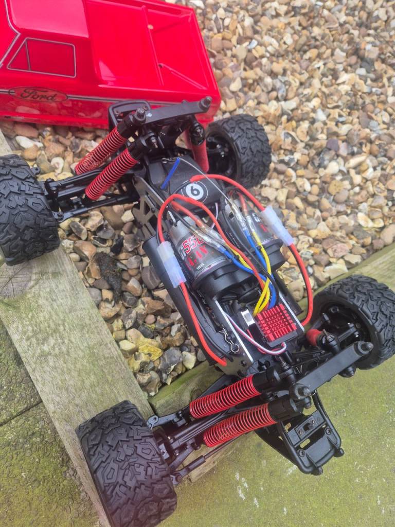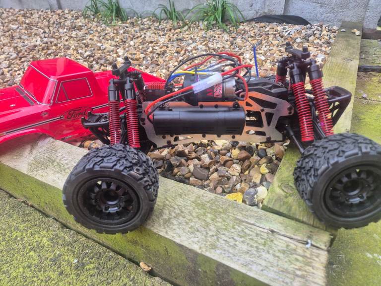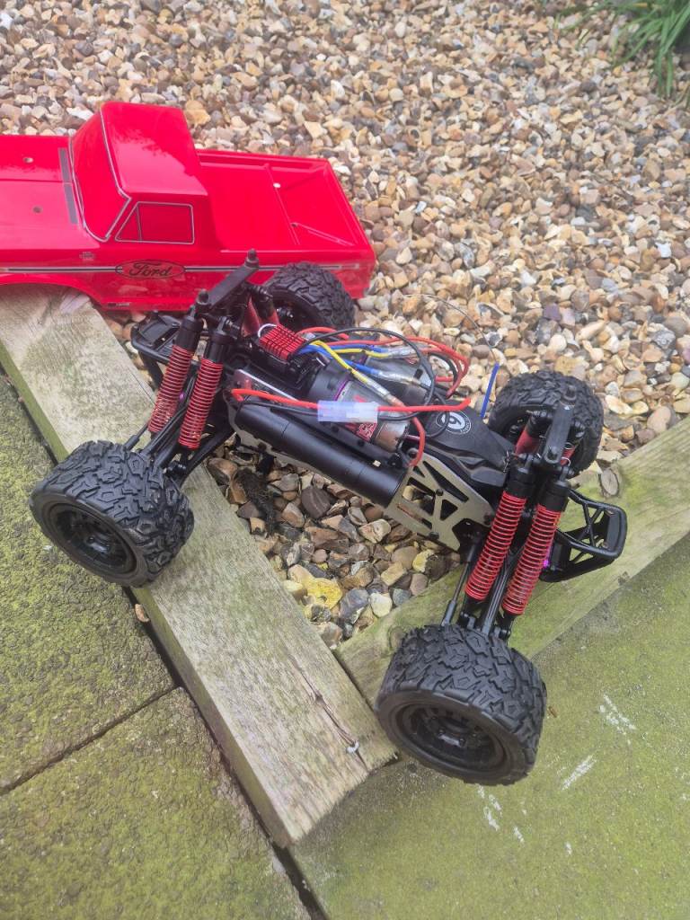 Hpi E savage with a brand new body, new tyres and wheels, new oil in all 8 shocks, new diff oil, and a hobbywing 880 esc, this twin motor truck pulls wheelies for fun