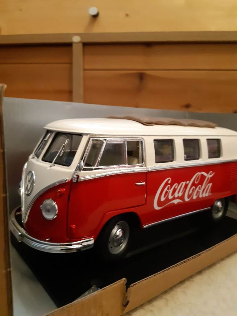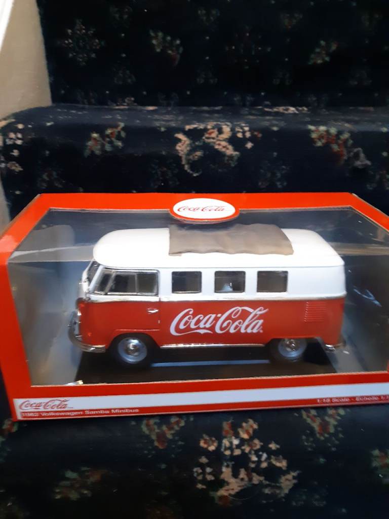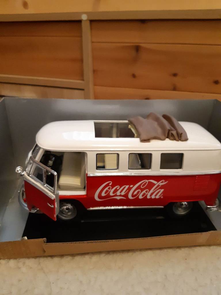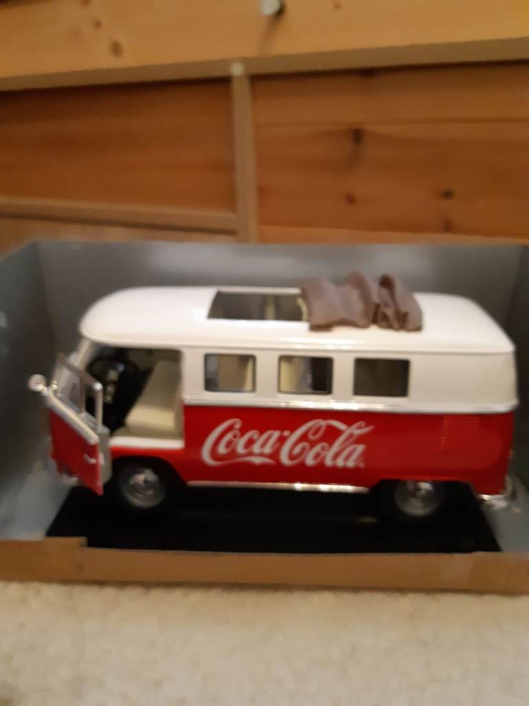 NEW still in box 1/18 scale VW samba bus with opening doors tailgate and slide back sunroof highly detailed front wheels are poseable/steer, decorative and collectable COKE livery, pick up only please leave a message.